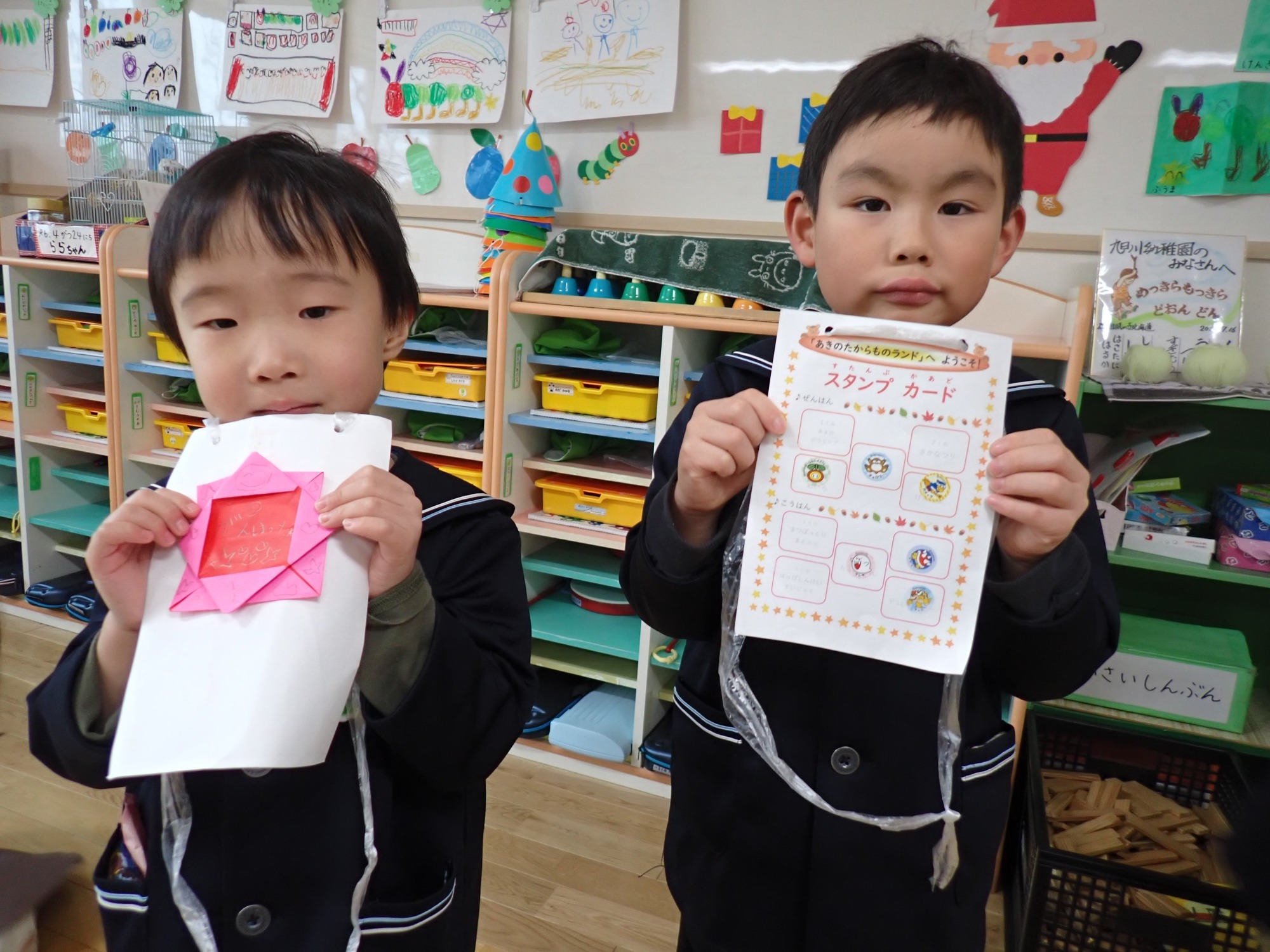今日は年長組が小学校にお出かけをして一年生と交流をしてきました。大きな校舎、階段や廊下などをみて、「小学校って広いね」とお話ししていました。「あきのたからものランド」という自然物をつかう遊びで、ボウリングやめいろ、さかなつり、けんだまなどたくさんでした。一年生が優しく遊びを教えてくれて安心して遊んでいたゆりぐみです。さかなつりでは、「釣れたよ」と嬉しそうしていたり、遊びが終わるとカードにシールを貼ってもらい、様々なコーナーで遊ぶことが出来ました。「たのしかった」「小学校たのしみ」と小学校への期待も高まりましたね。
