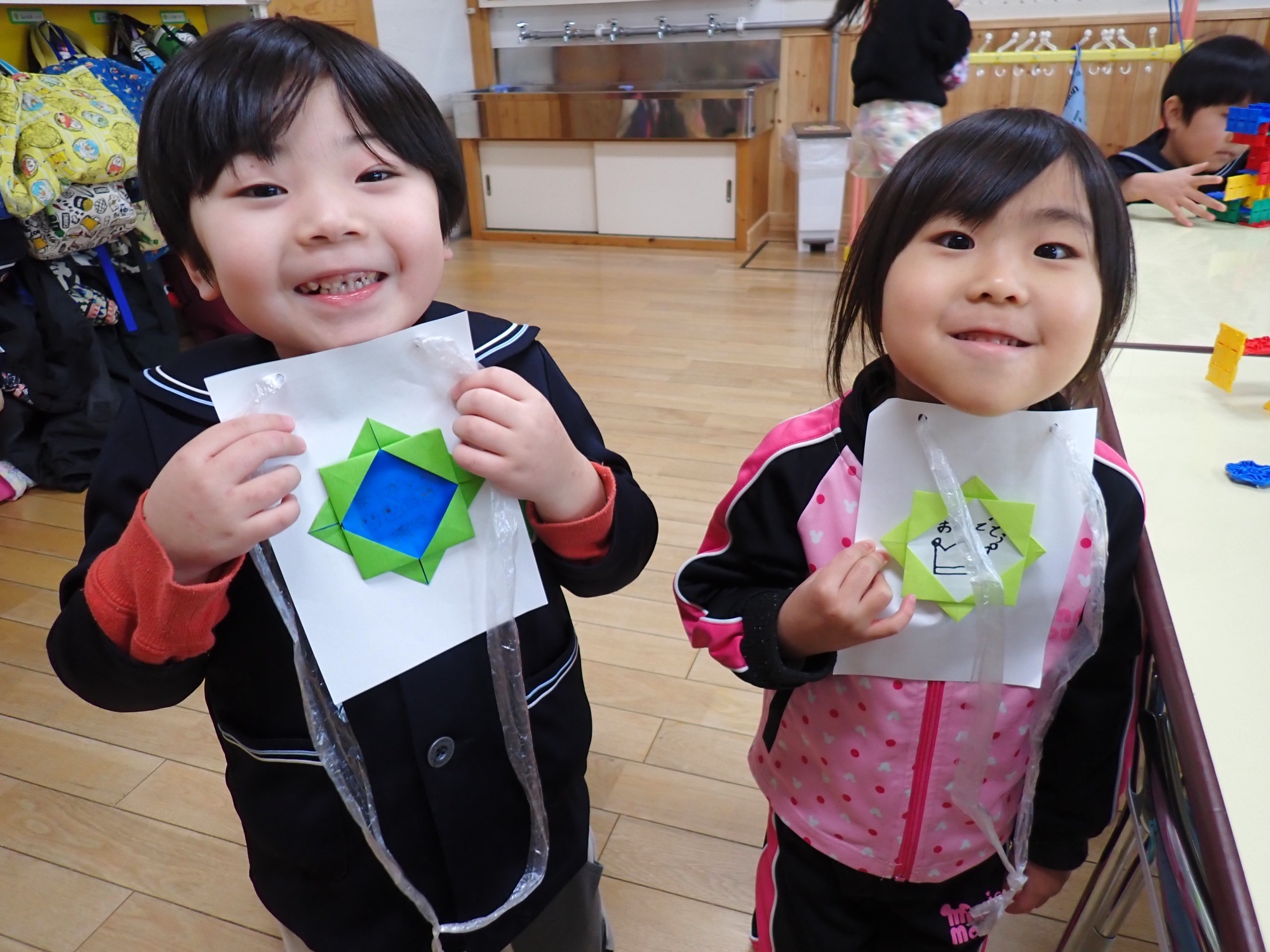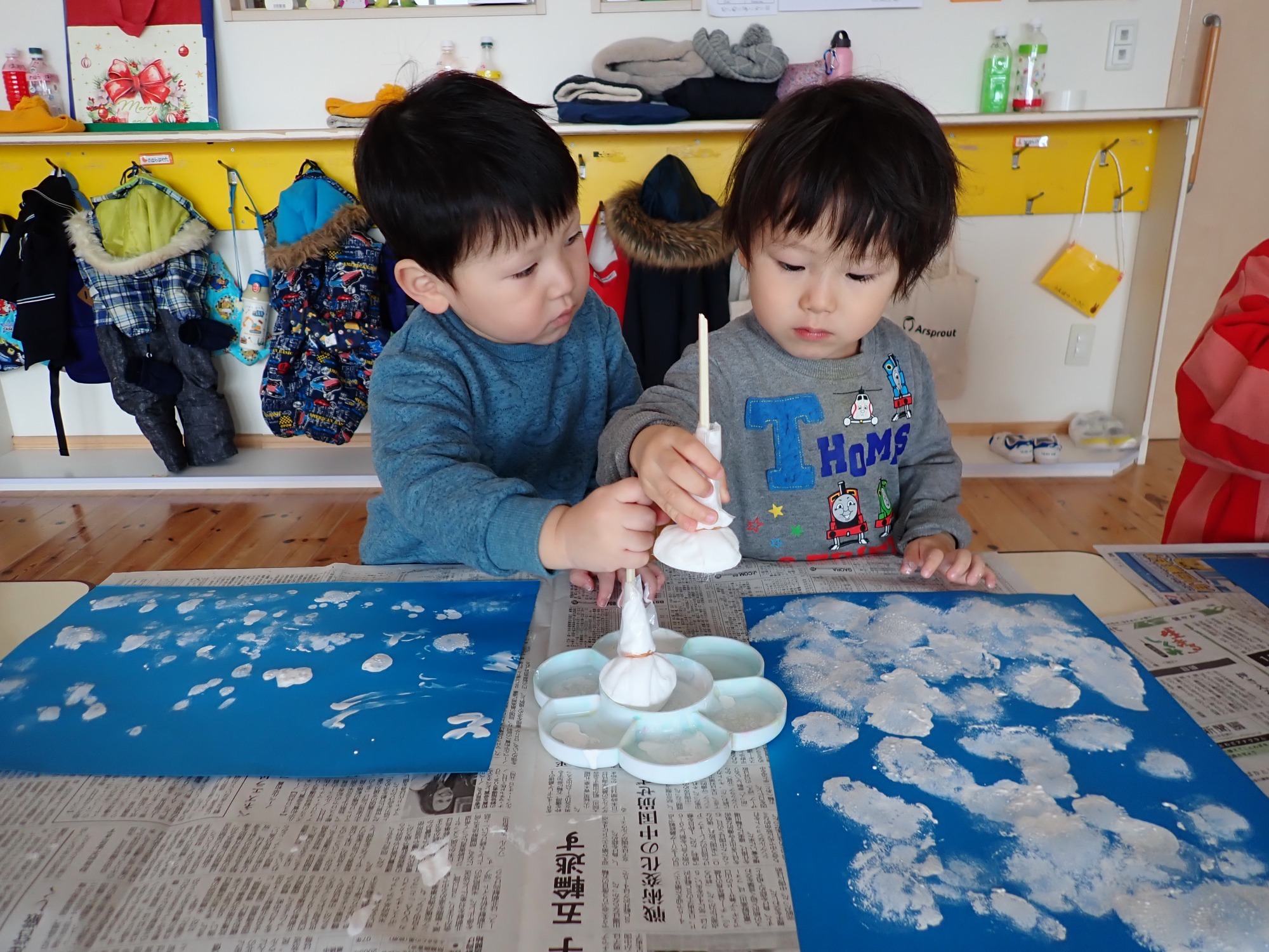 年少組のお飾りです。絵の具を使いました。二つ折りしたツリー型の片方にかわいい指で絵の具をチョンチョン! 「ここにも、つけよう!」、「何色にしようかな?」と、真剣な表情です。そして、二つに折ってしっかりと手のひらでアイロンをかけると… こんなステキなツリーのできあがりです。さあ、どこに飾ろうかなぁ…