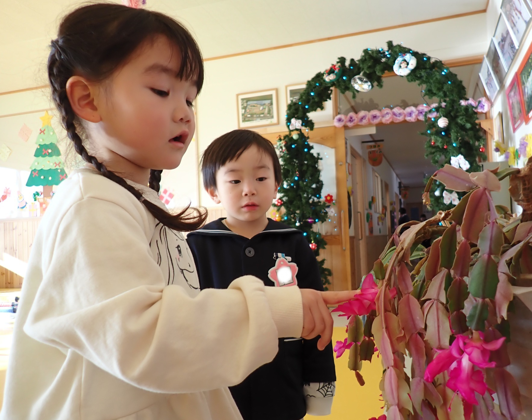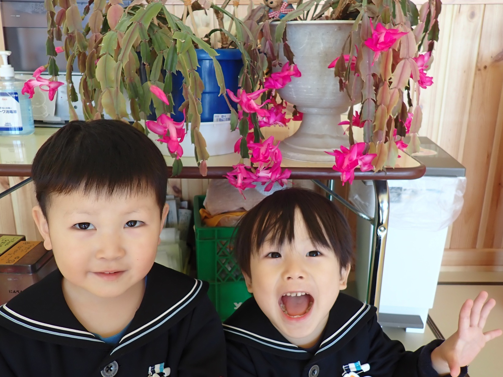 今年もきれいな花をつけてくれたシャコバサボテン。鮮やかなピンク色が、冬の季節に元気をもらえますね。「うちにも、おんなじお花、あるよ」と、かわいいおしゃべりが聞こえました。今日は「英語であそぼうの日」。みんなの様子を見守ってくれる幼稚園のシャコバサボテンです。