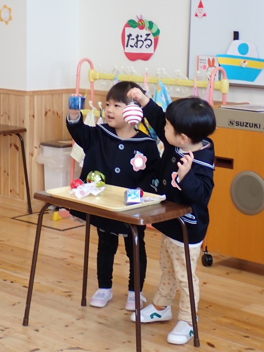 歌あそびをしている年少組です。“クリスマスといえば”…何でしょう? 皆さんは何を連想しますか? 年少組はいろいろな物で「クリスマス(の物)かな? 違うかな?」と、先生や友だちと“クリスマスといえば”の歌に合わせて楽しく当てっこしましたよ。当たった時は大喜び!外れた時はちょっとガッカリ… でも、ワクワクしながら当てっこできました。その後も、またまた当てっこあそびのパネルシアターです。“はてなボックス”には、何が入っていたのかな? 考える表情がとても豊かでかわいい年少組です。