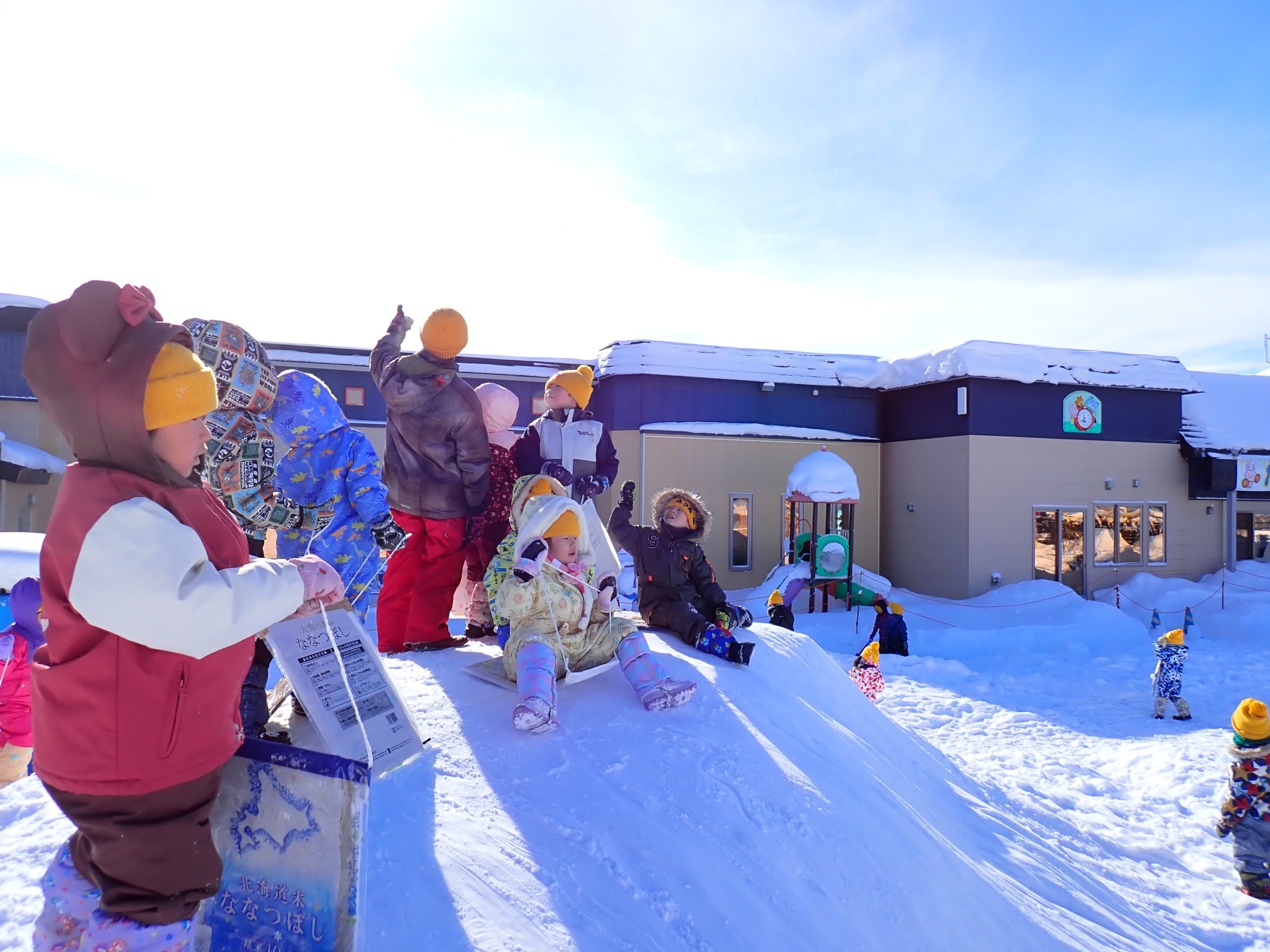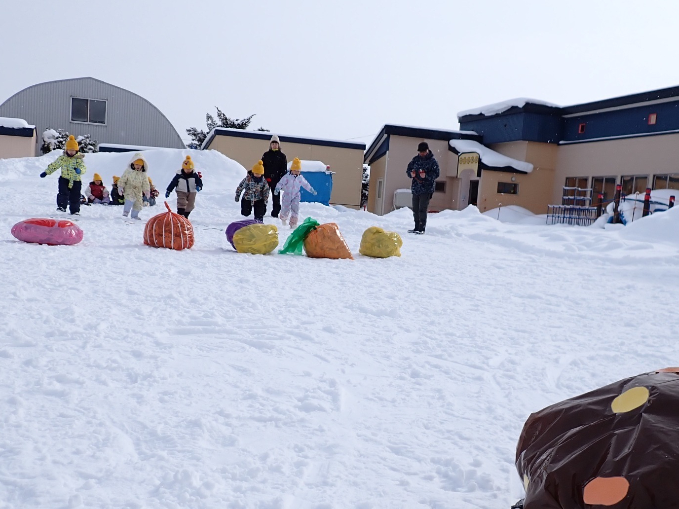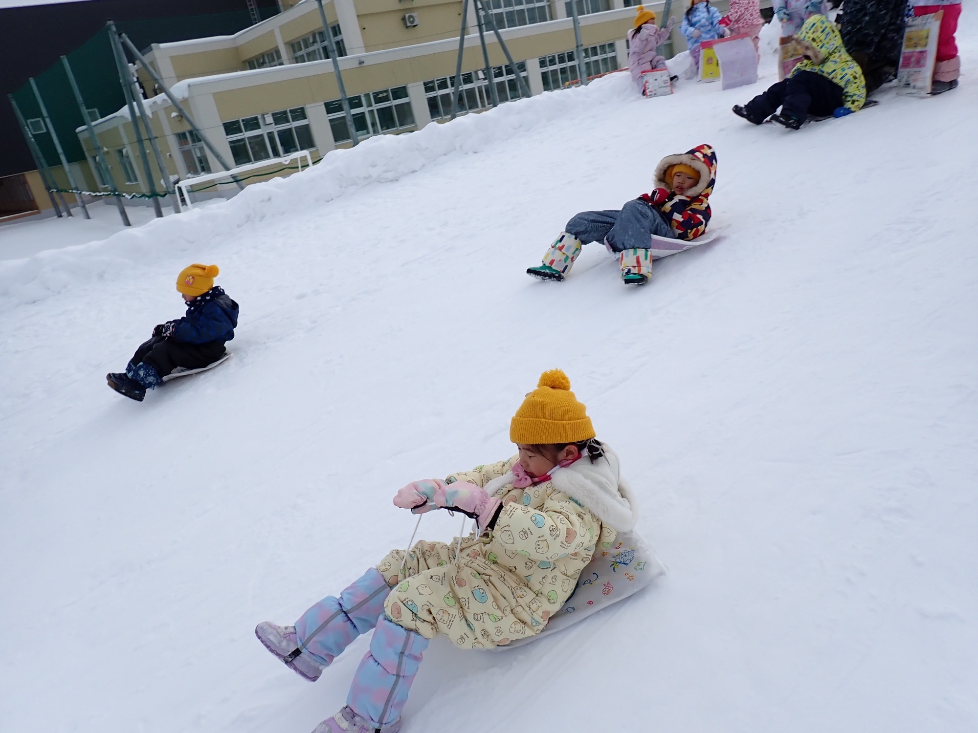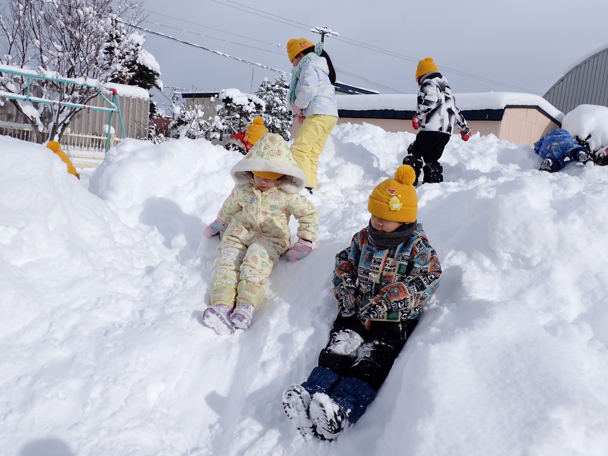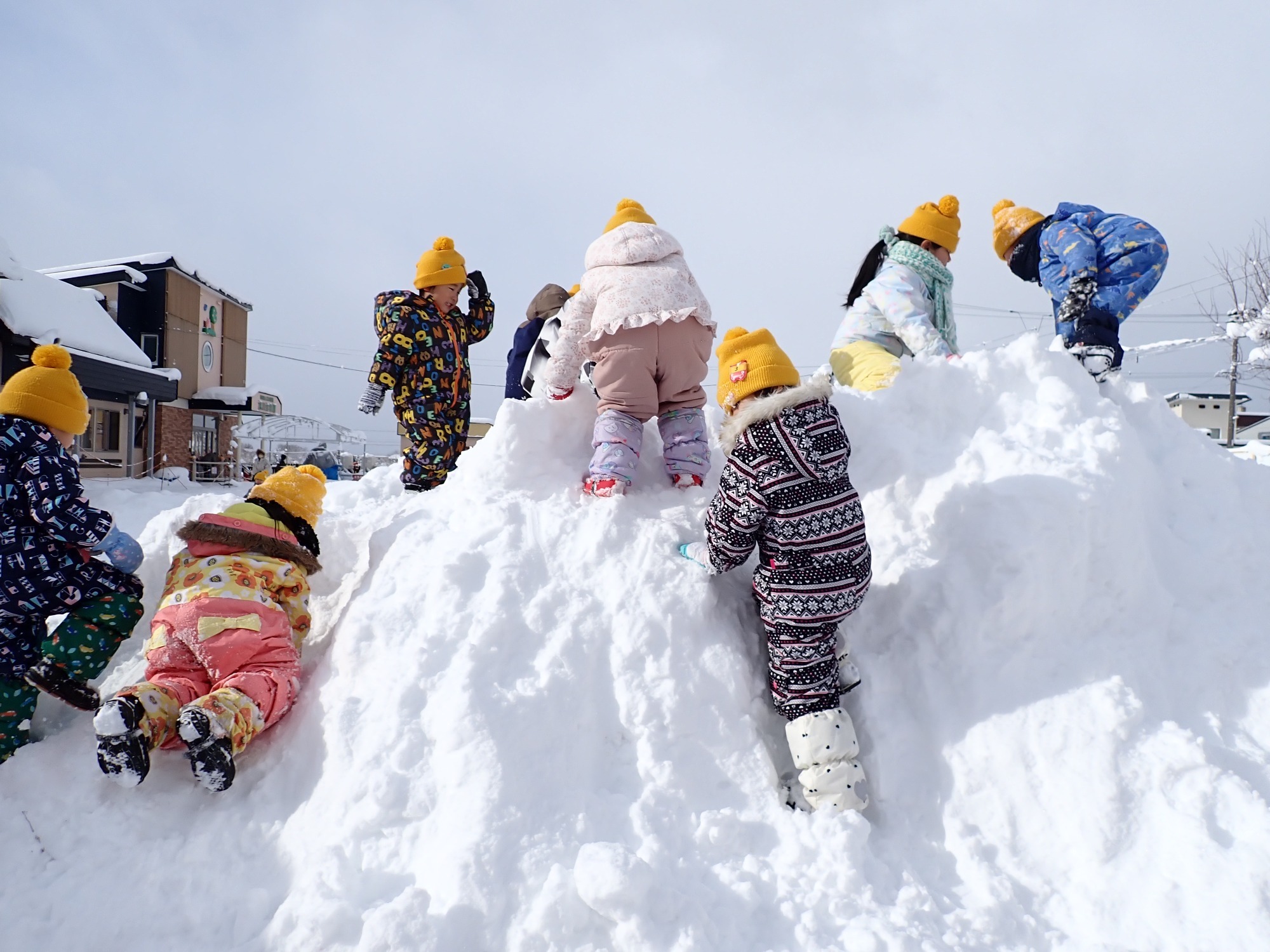 園庭にできた、雪の山。(除雪の時の雪です)まだまだ小さくてデコボコですが… 子どもたちはなんのその! 登っていきました。一生懸命に登っていく後ろ姿がかわいいですね。登ってからは、お尻でシューッと滑ります。ゴロゴロと転がって降りていく子も… 「ウワー!!」と、歓声が冬空に響きました。何度も何度も繰り返し、たっぷりと遊ぶことができましたよ。バナナボートも楽しいけれど、雪の山もこんなに楽しいのです。