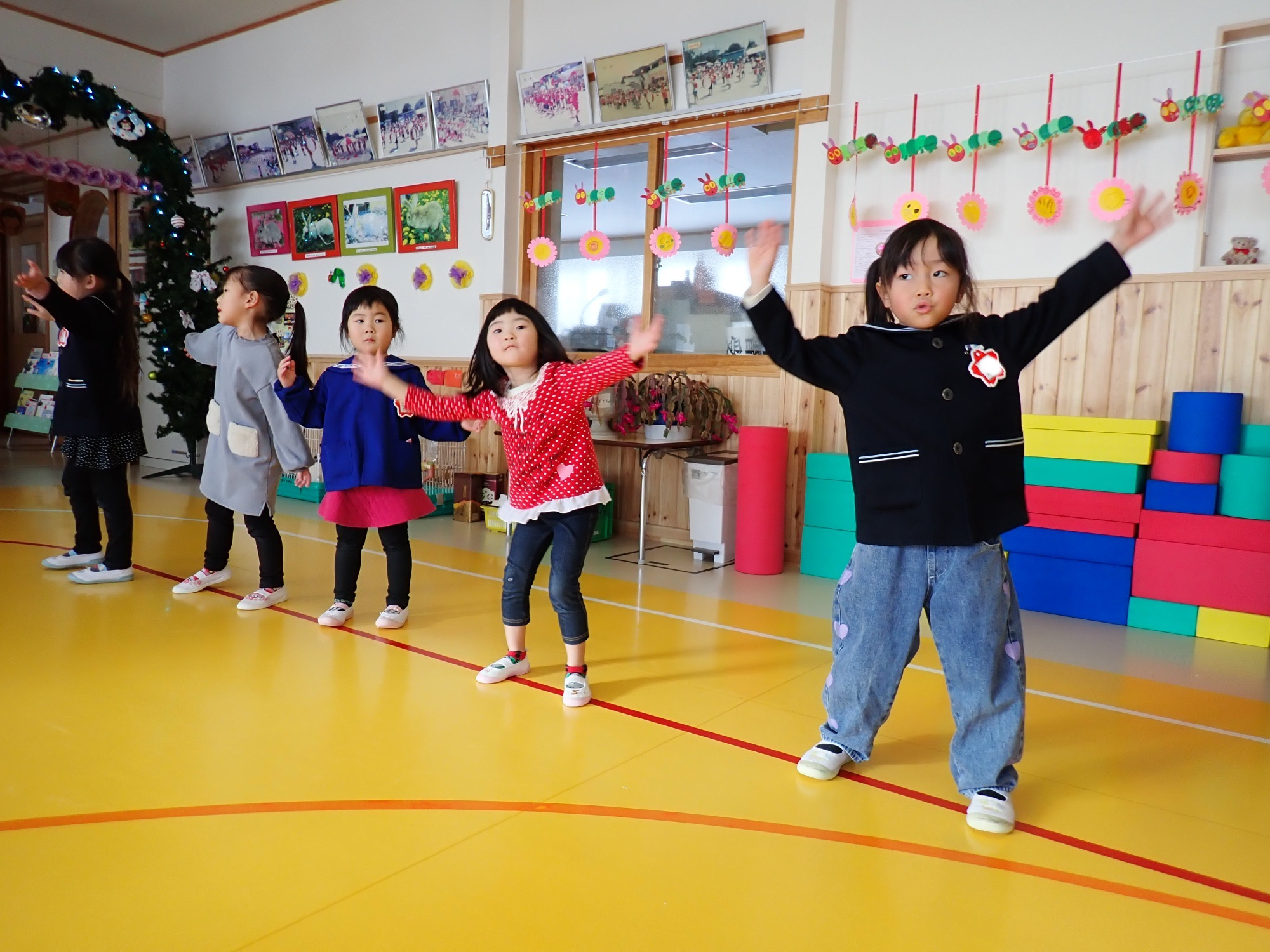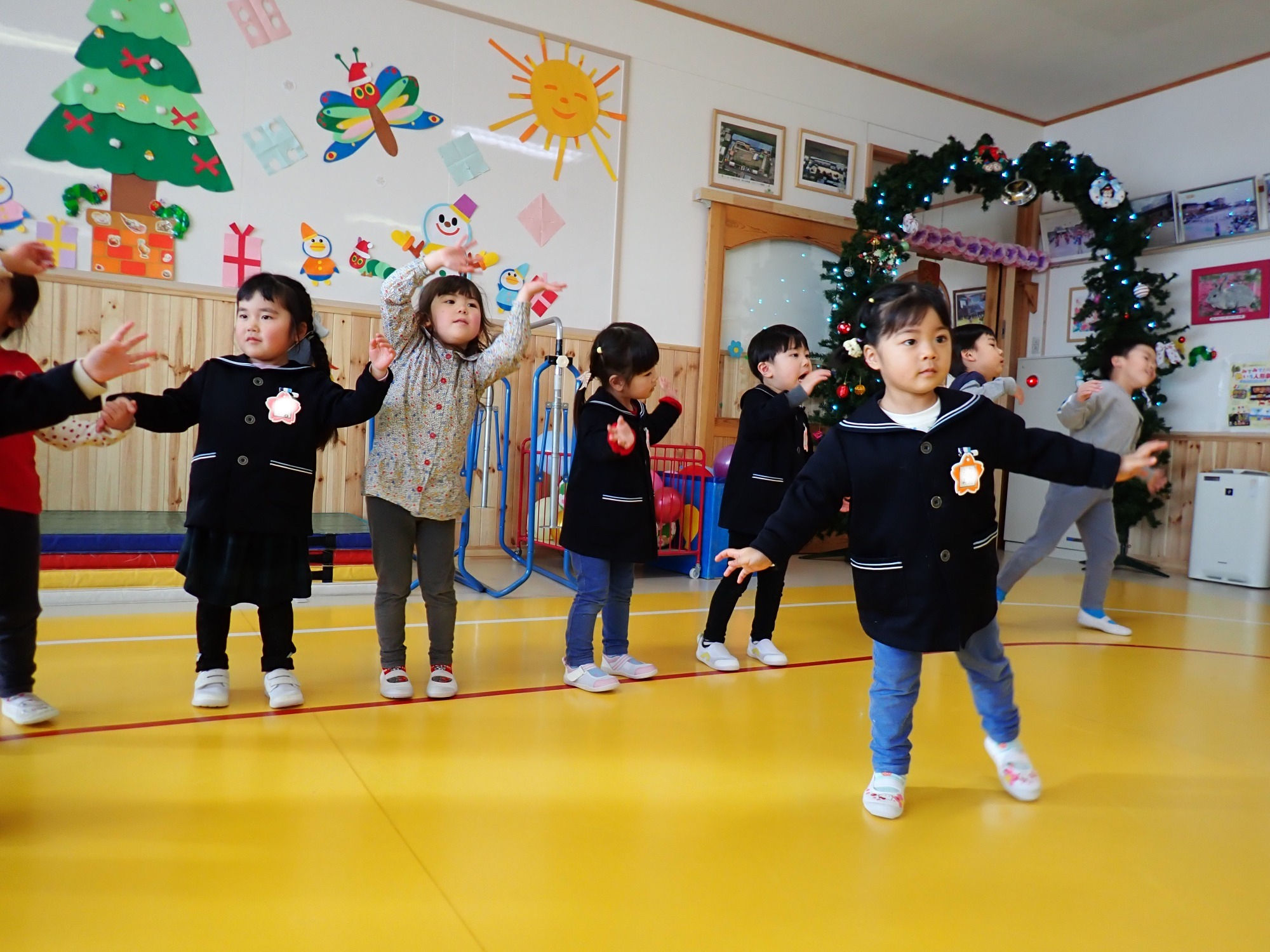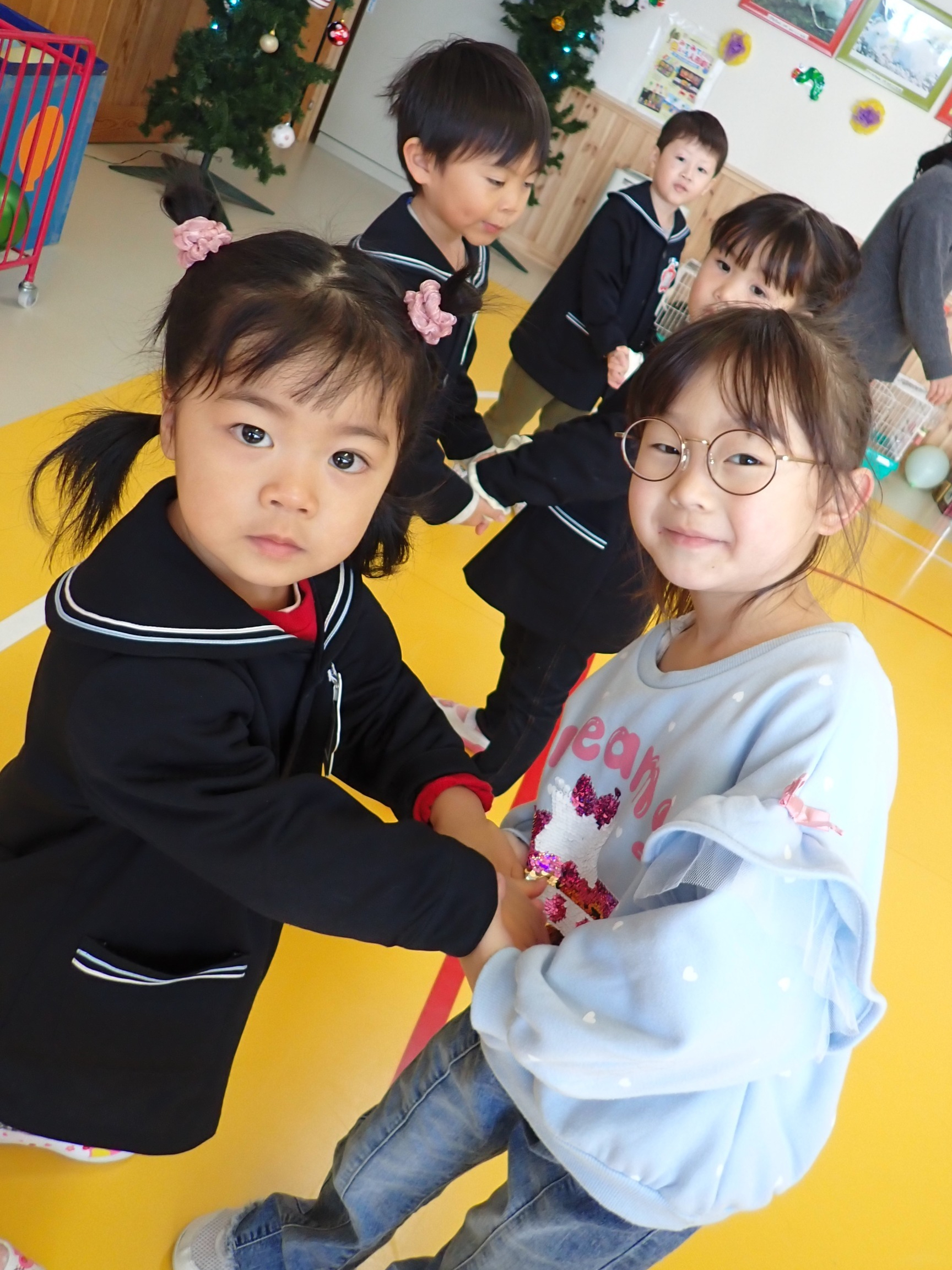 “ジングルベル”の曲に合わせて、みんなでフォークダンスをしました。小さいお友だちは大きいお友だちと手をつないでもらって、嬉しそうですね。リズムに合わせて、ウキウキ気分でした!