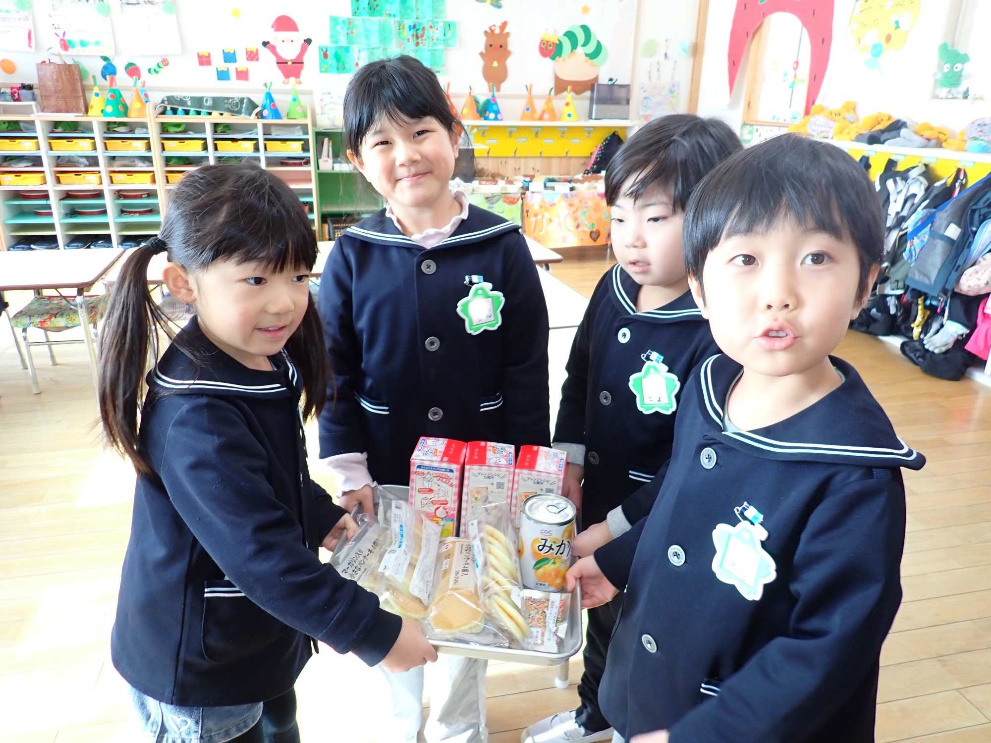 今日は、「おかえし」の絵本を見たり、おじいさんとたぬきのペープサート(「たぬきの恩返し」)を見て、子どもたちも見よう見まねで… 明日は保護者の方も一緒に楽しみましょうね! きっと心が温まるお話ですよ。その後は、引き続き給食試食会もあります。園開放のお子さんも、人形劇を観て、幼稚園の給食を食べてみましょう!