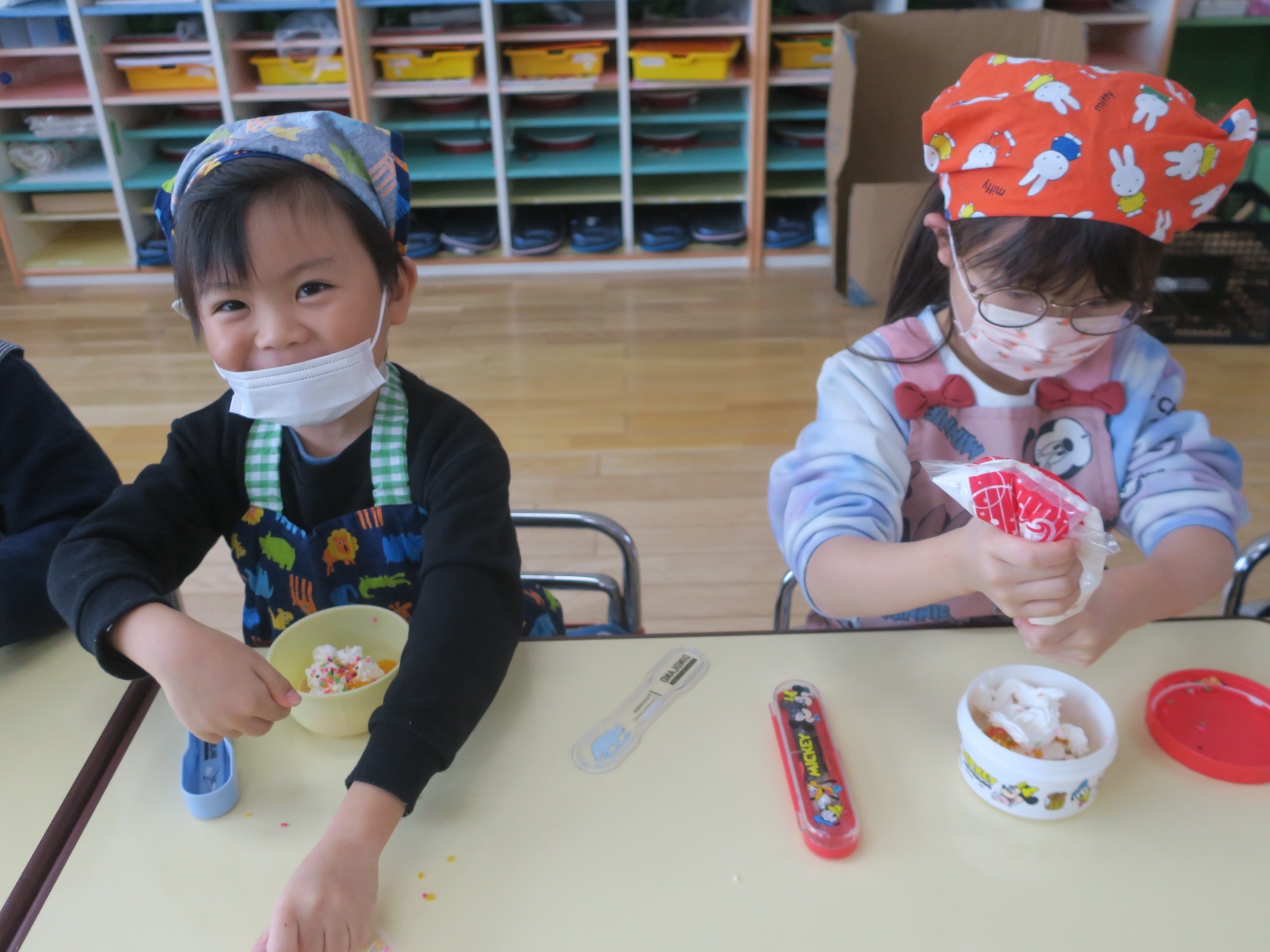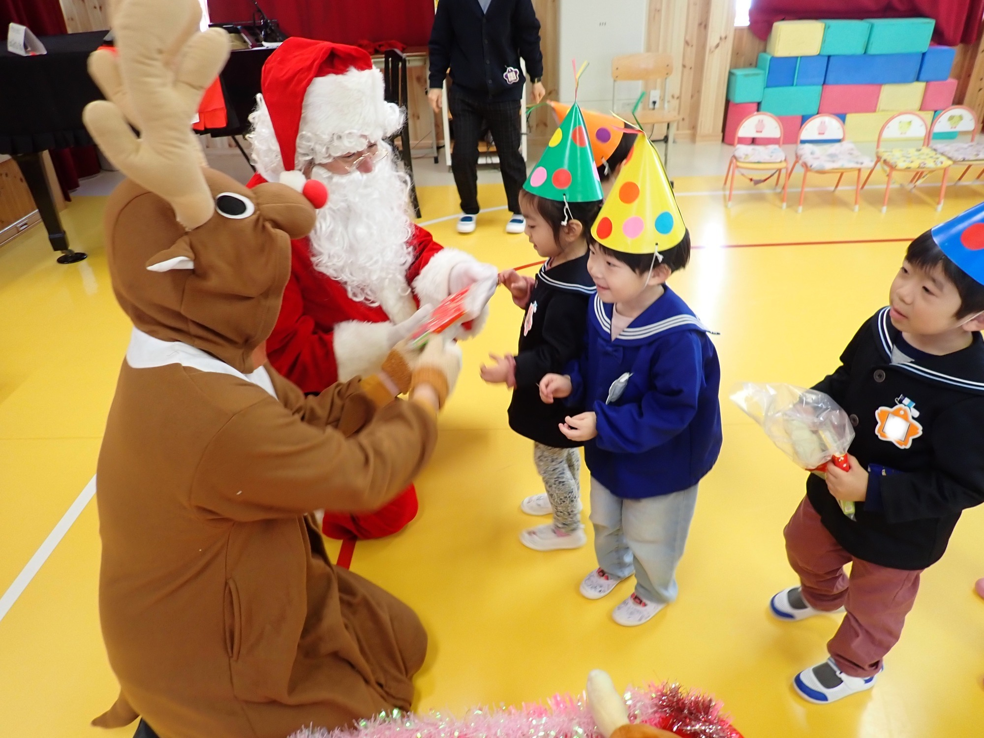 園長先生から≪イエスキリスト様≫のお話を聞きました。「あわてんぼうのサンタクロース」の歌を歌ったり、鍵盤ハーモニカで「ジングルベル」を演奏したり、フォークダンスをしたりと盛りだくさんの会になりました。メインイベントはトナカイさんとサンタクロースさんの登場です。ユニークなトナカイさんに親しみを持ち、大きなサンタクロースさんにびっくりしたり… 楽しい時間となりました。一人ひとり、プレゼントをいただき、喜ぶ姿もまたかわいらしかったです。その後は、ケーキクッキングです。自分のケーキを作りました。「おいしいね!」と、ご満悦! 心に残る一日となったことでしょう…