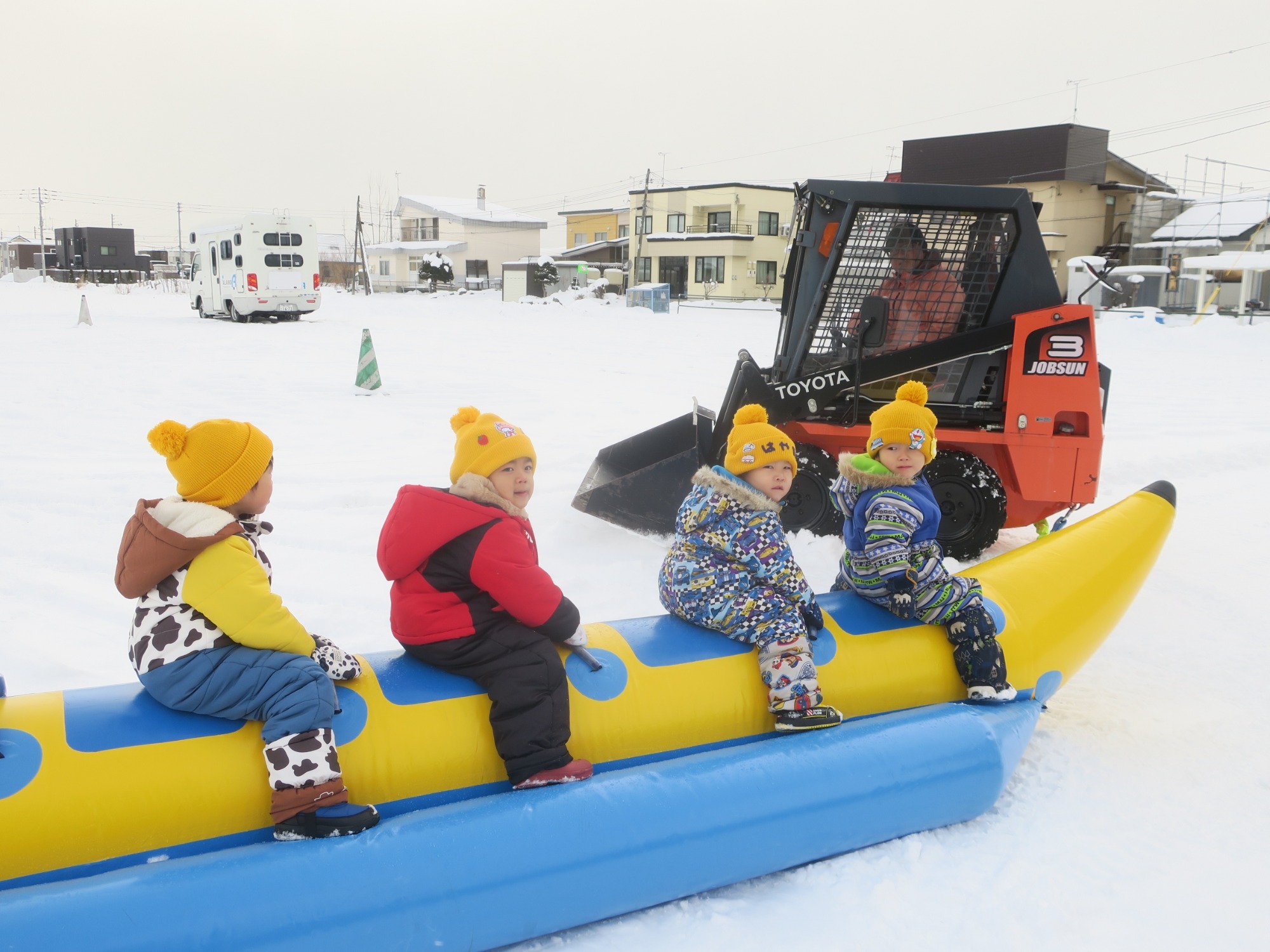 旭川幼稚園の冬の恒例、“スノーバナナボート”の時期がやってきました。雪が降るたびに「はやく、のりたいね」と、心待ちにしていた子どもたちです。今日は、バナナボート初日です。白くなった園庭に鮮やかな黄色が映えていました。小さいお友だちも、しっかりと捕まって、泣くこともなく楽しめました。発達段階に合わせて、スピードの調整をし、配慮しています。さあ、バナナボートの冬が始まりました! たくさん遊んで、北国の冬を大いに満喫しましょうね!