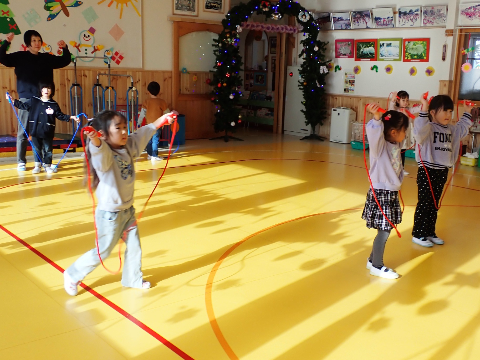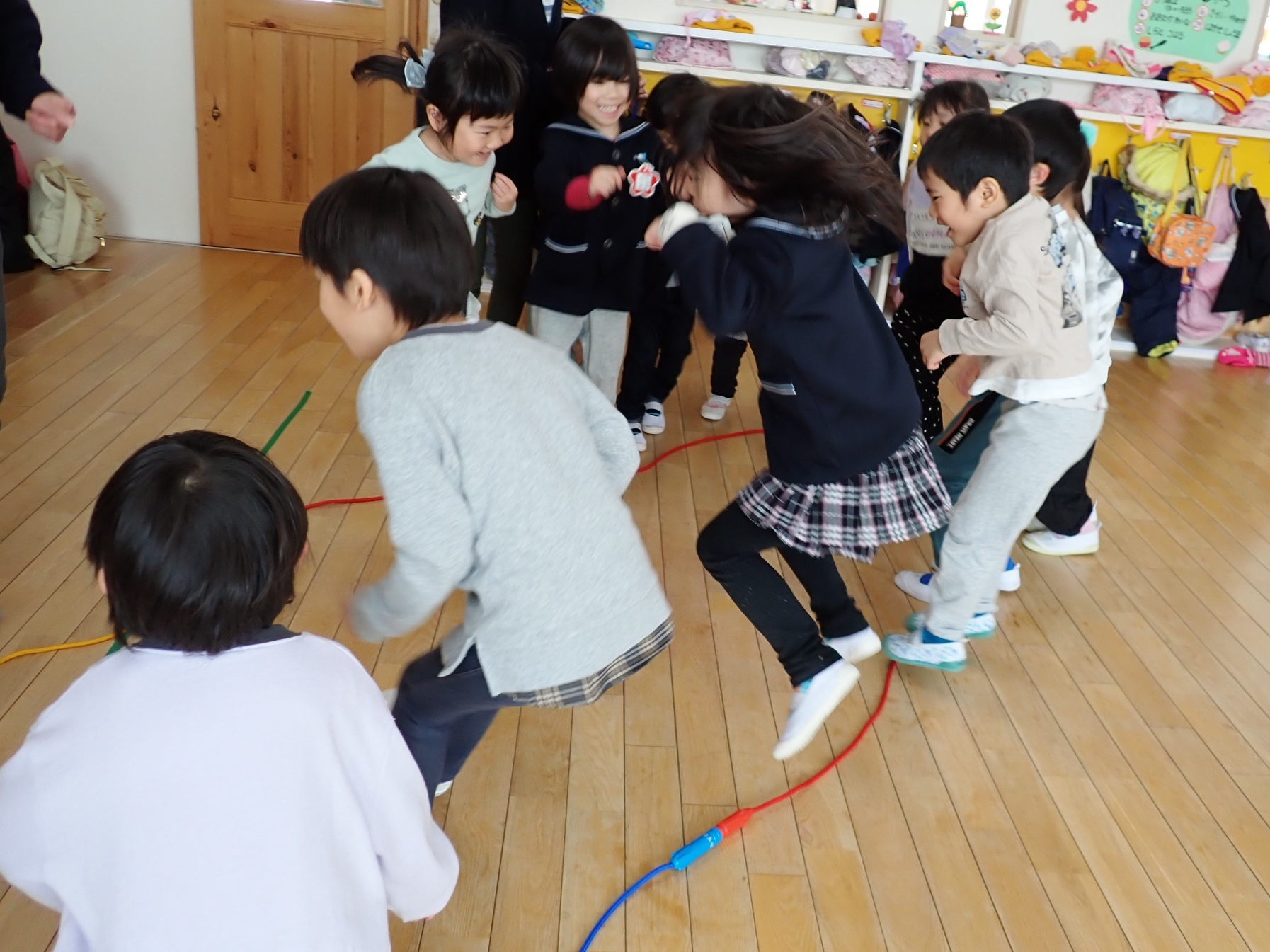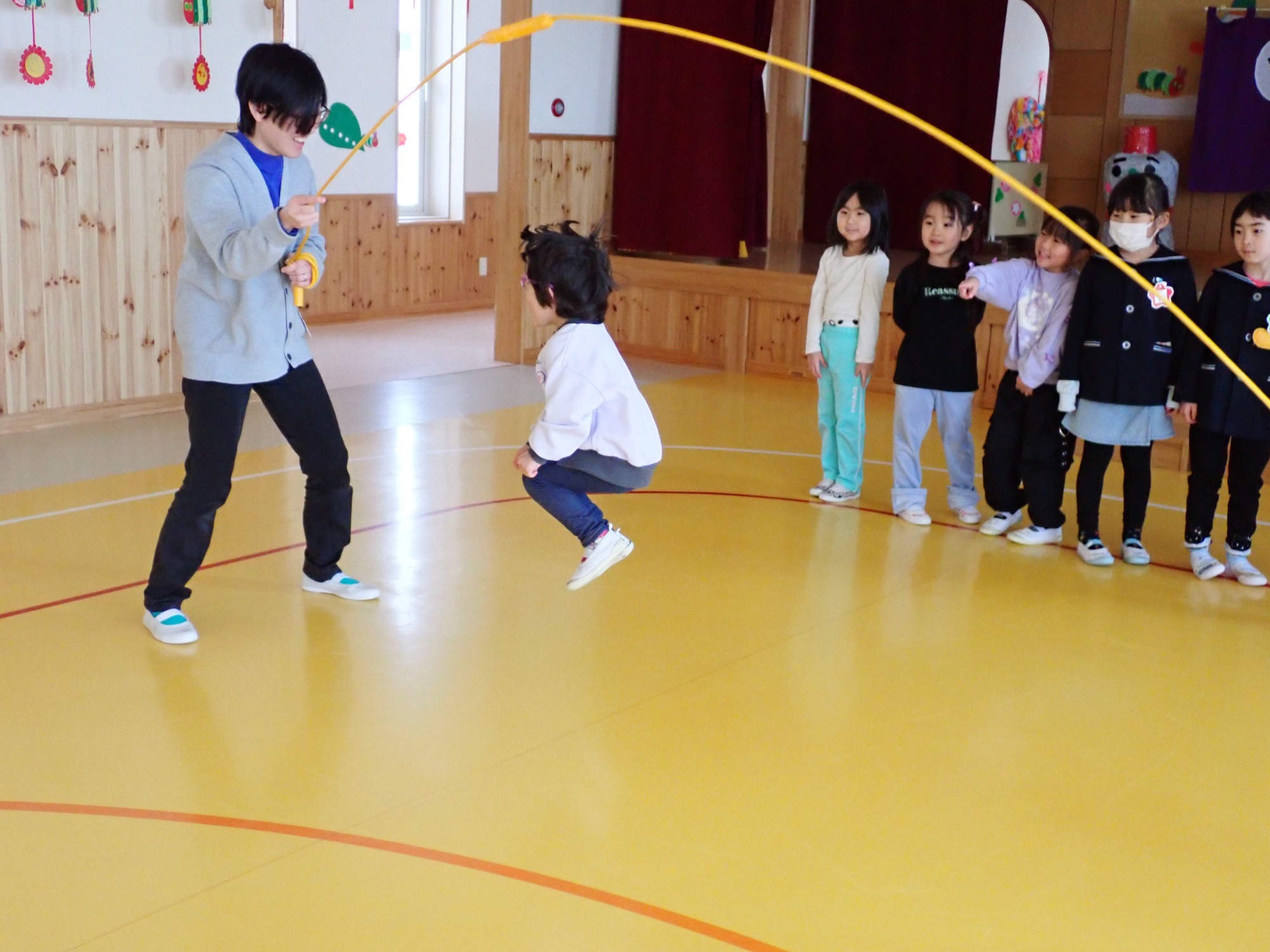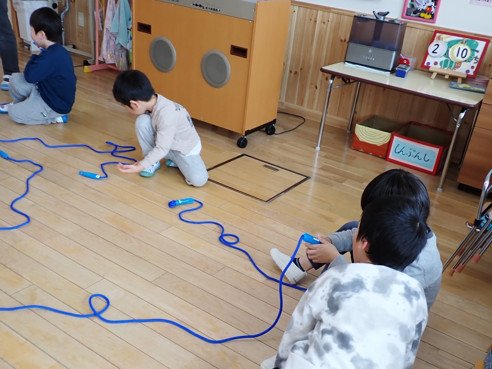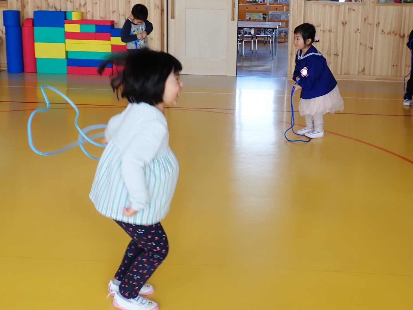 年中組のなわ跳びあそびの様子です。大好きな「ばななくん体操」の音楽に合わせて、なわを回したり、ピョンと跳んでみたり…、みんなができそうなことや興味のある動きを取り入れて遊びました。「ほら、できたよ!」と、喜んでいる様子も見られました。まだ、跳べなくても大丈夫! これから少しずつ少しずつ、みんなと一緒に楽しみながら身につけていきましょうね。きっと、できることが、また一つふえていくことでしょう。