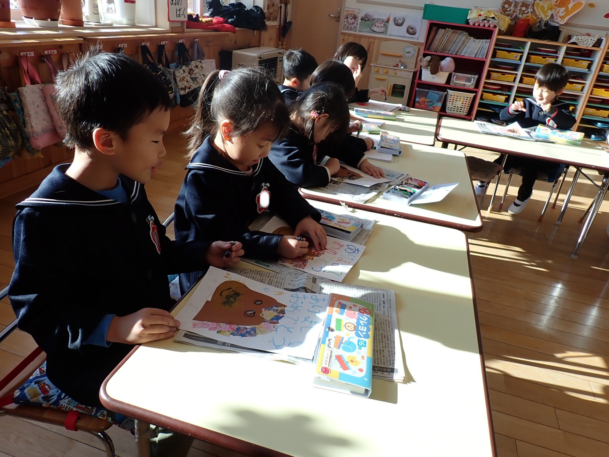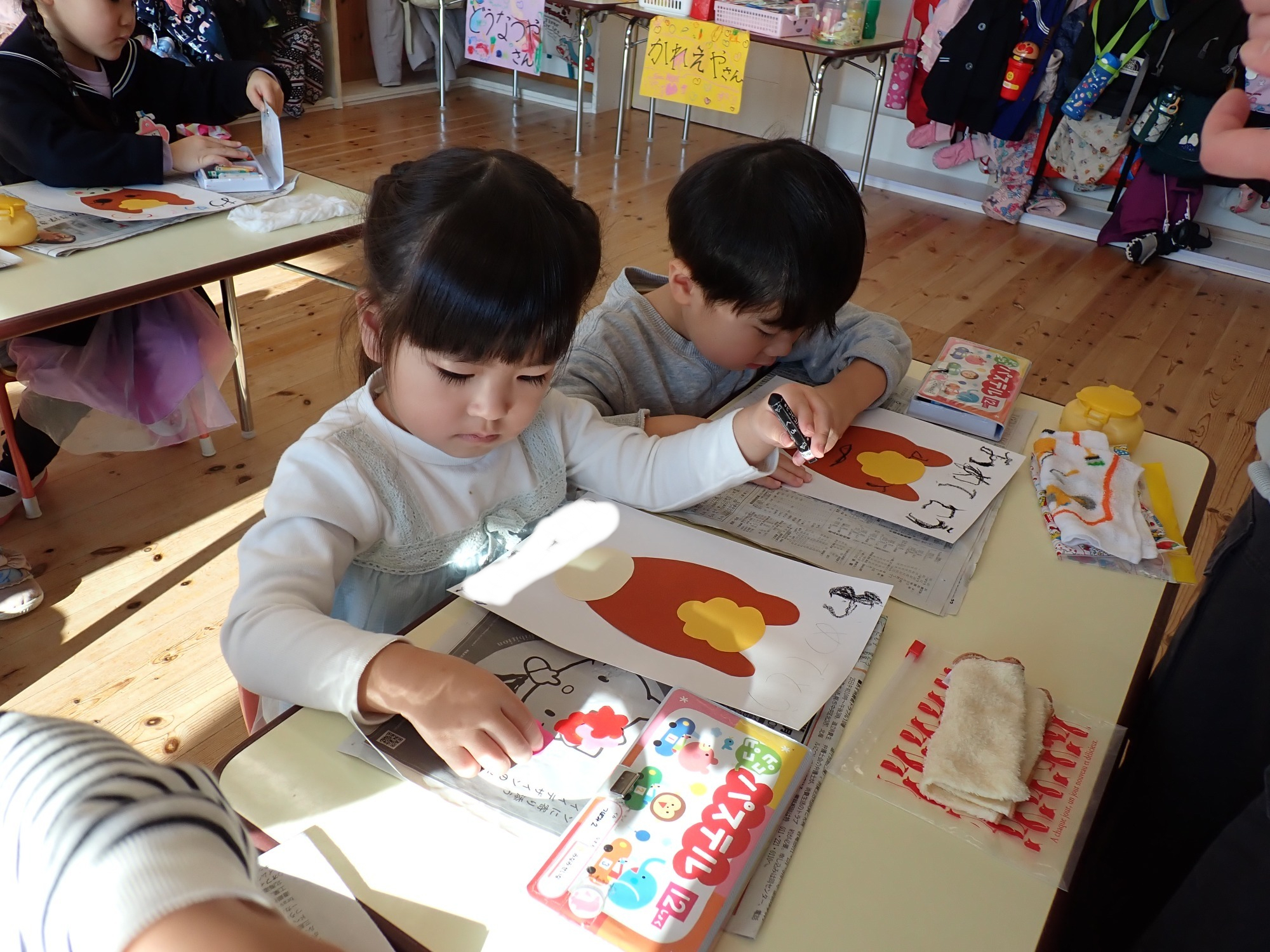 年中組は、「ようちえんのおともだちをさがしにいこう!」と、園内探検へ。出かける前に“ようちえんのおともだち”が描いてある、担任の先生の手作りの教材に色を丁寧に塗っていました。