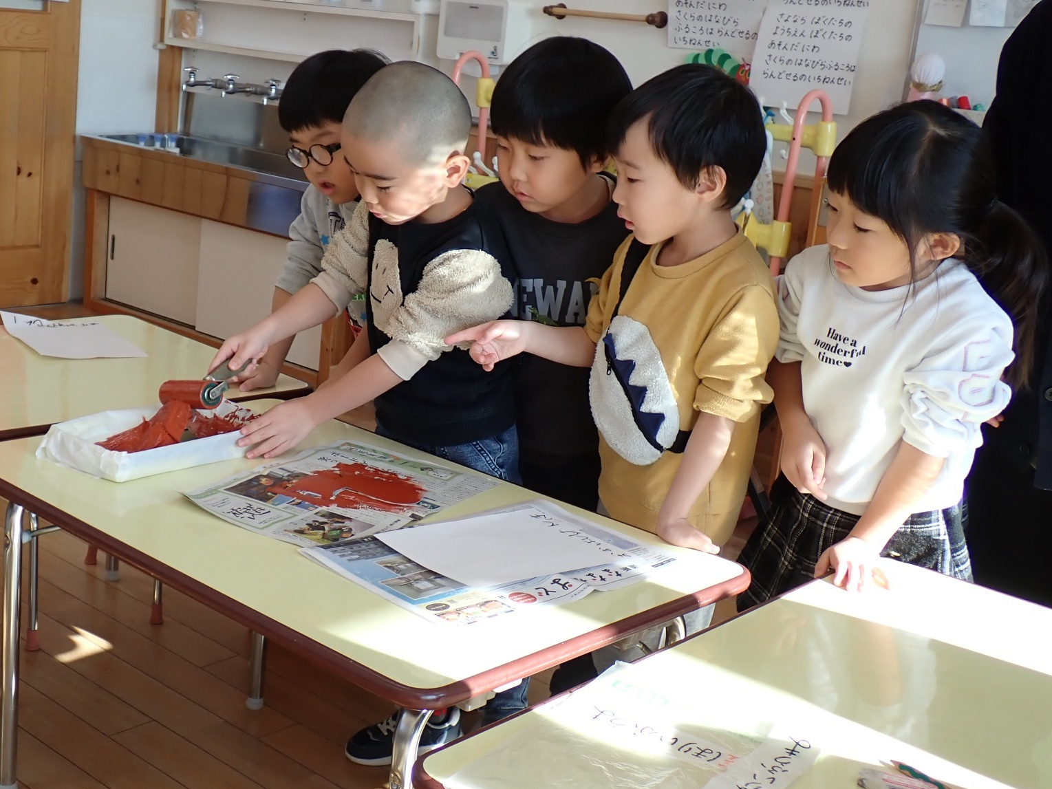 年長組が絵の具で遊びました。絵の具を筆で画用紙にたらして、その後「フー!」と、吹きました。しゃぼん玉を作る要領です。作り方を先生に教えてもらって、よく理解ができていました。ほっぺがかわいいですね。「きれいだね」、「ほら、こんな模様になったよ」と、自分の造形表現に喜ぶ姿が見られました。