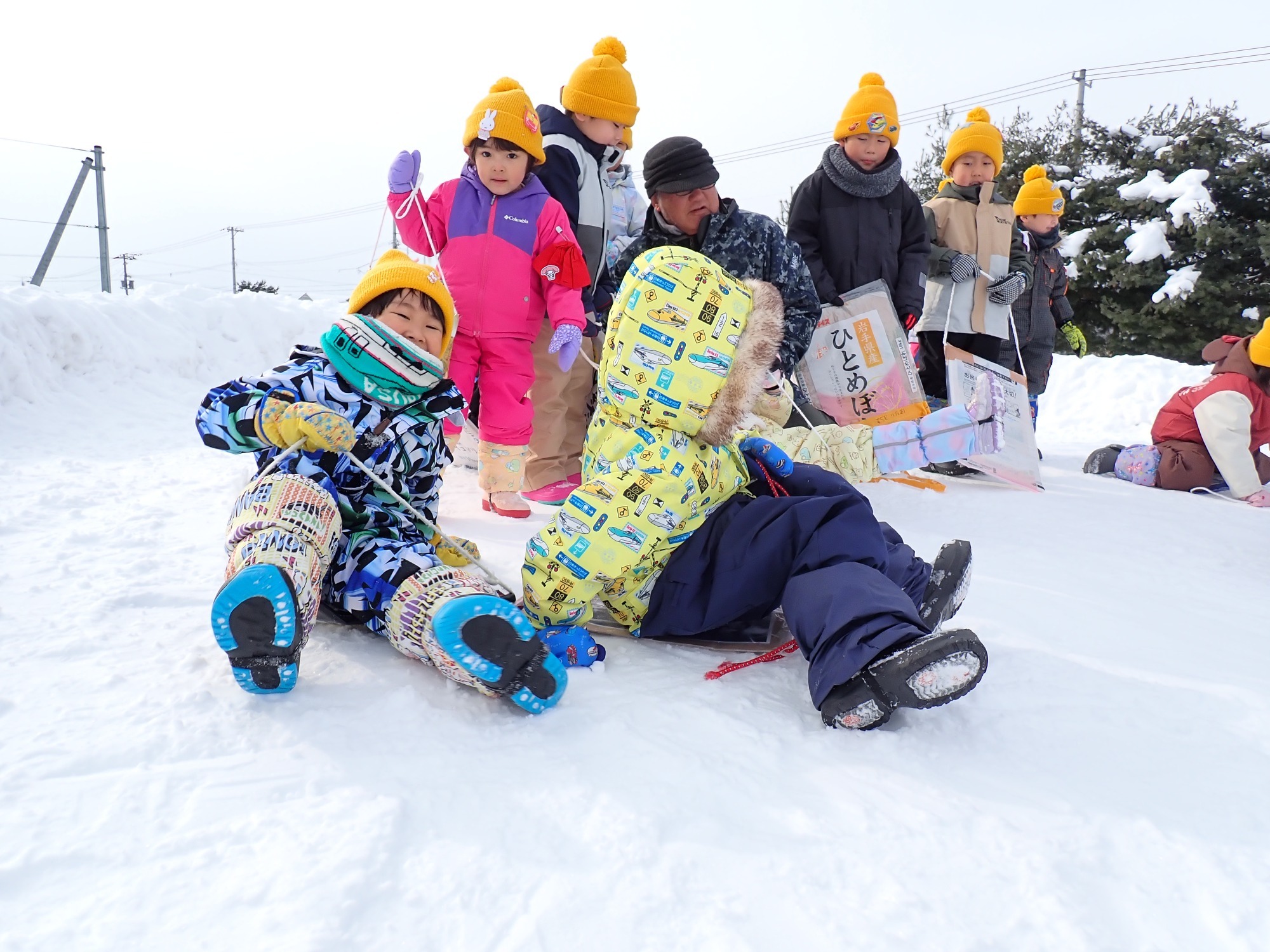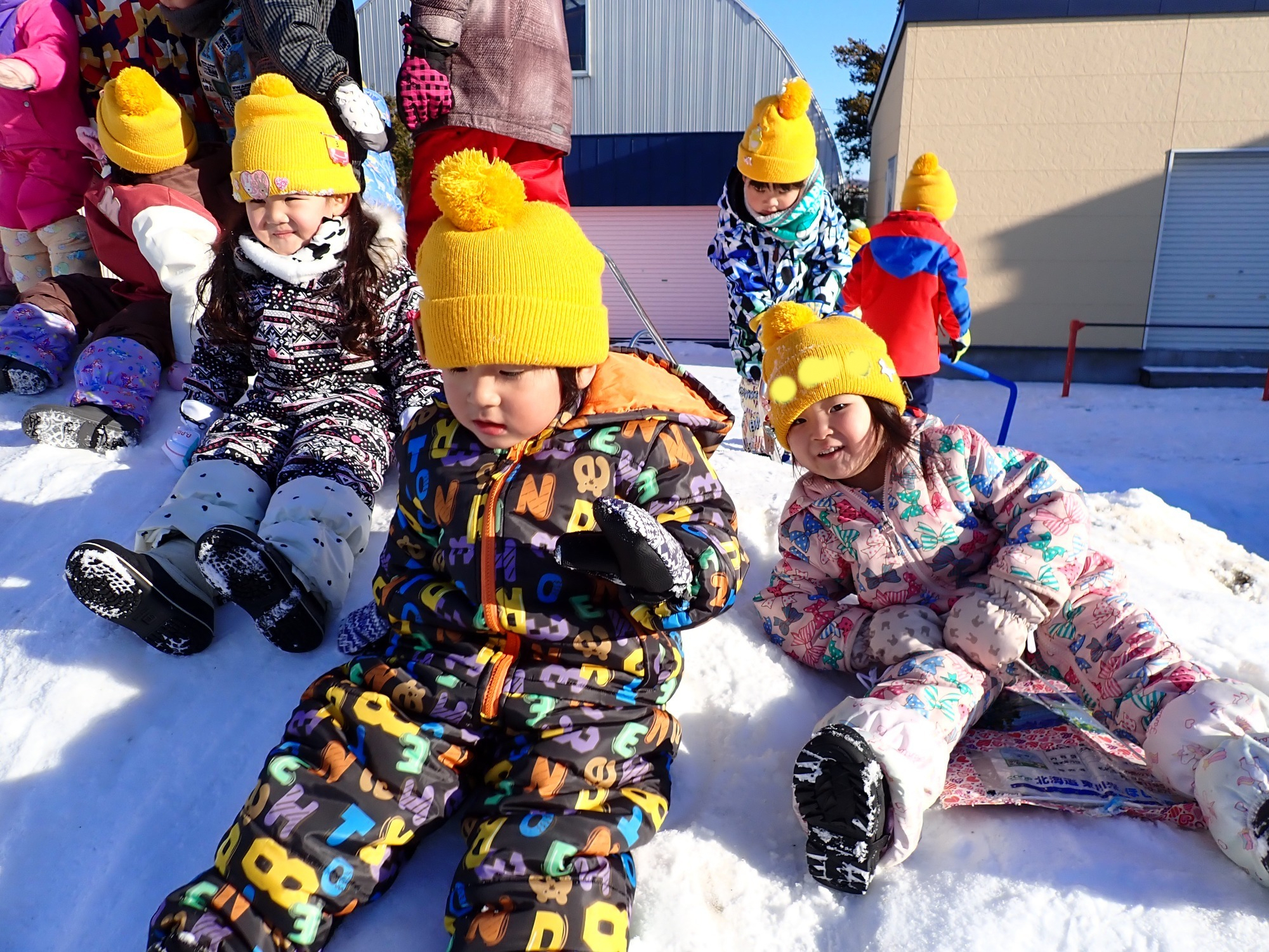 年中・年長組で行きました。お山を借りて、そりすべりをしましたよ。遠くまですべって、ニコニコ笑顔です。