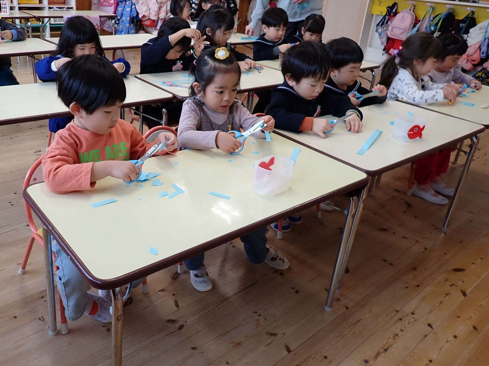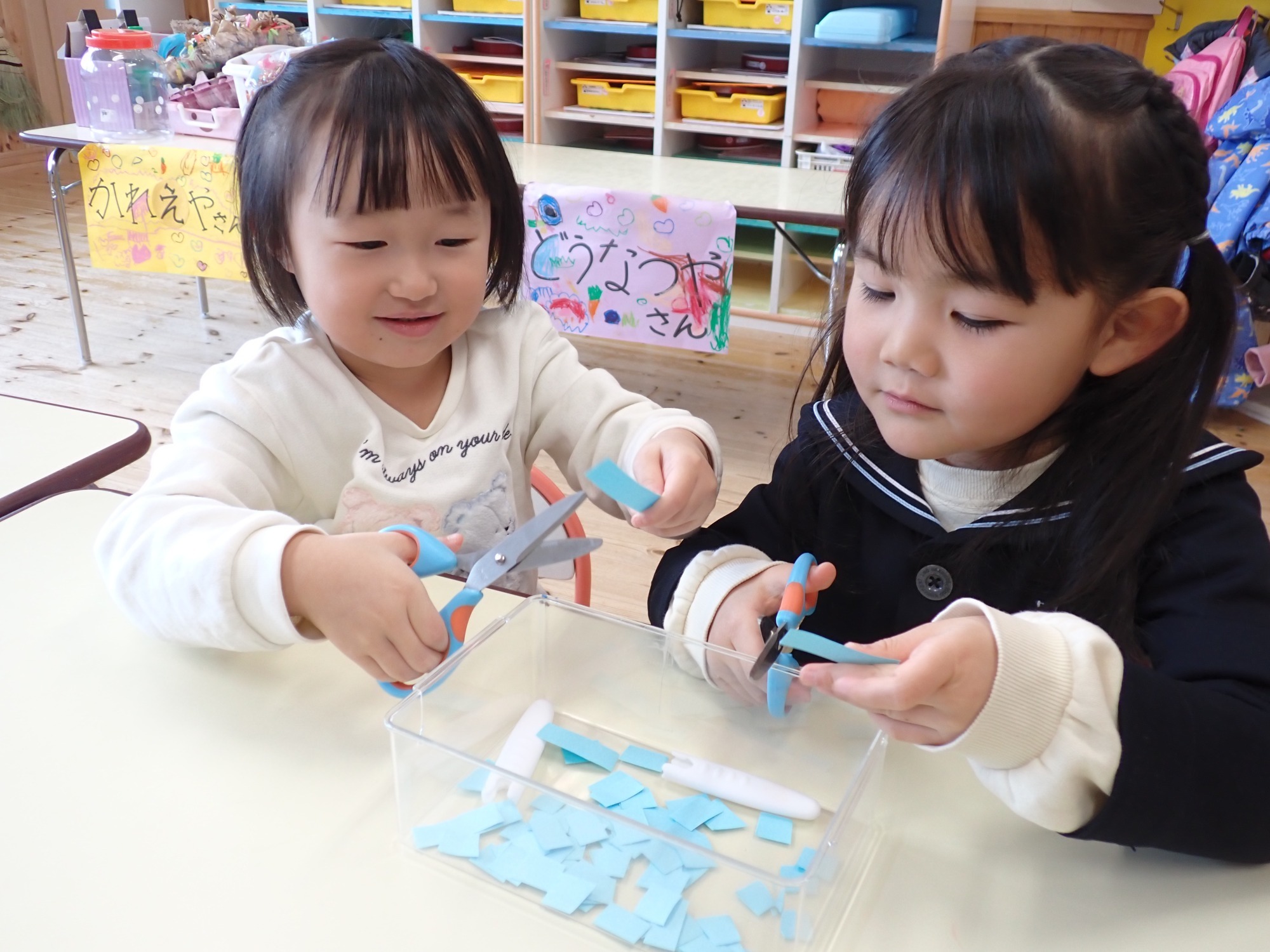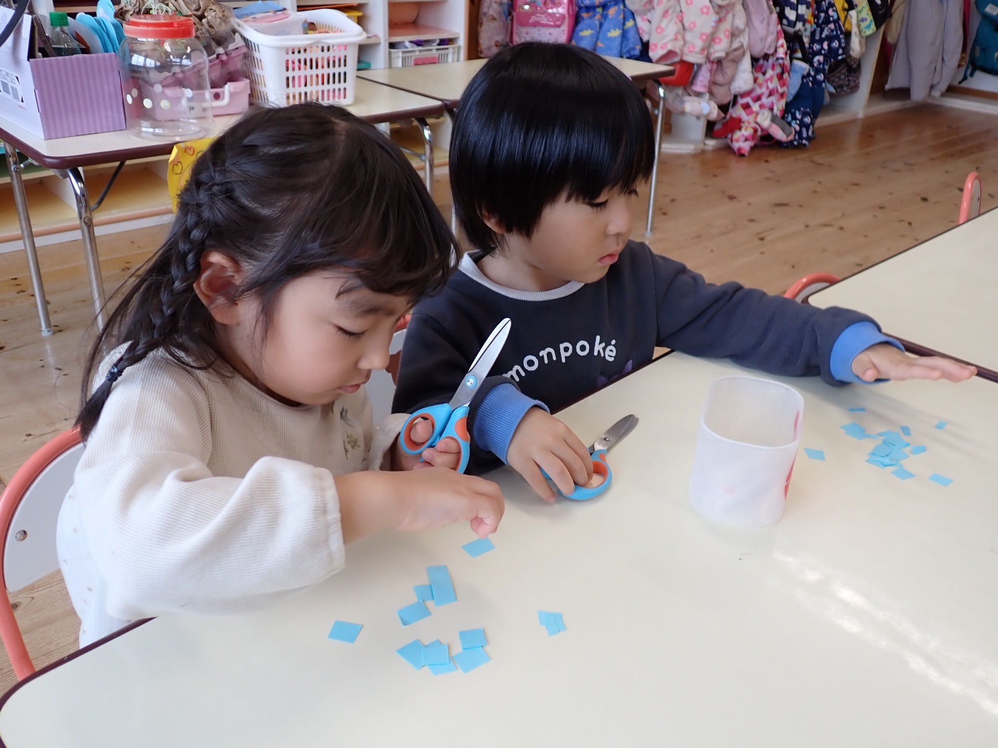 さて今日は、年少組がはさみでチョキンと切っていました。切ることの楽しそうな様子、口を一文字に結んで一生懸命な様子など、様々な表情が見られました。水色の紙は、雪です。たくさんの雪になりました。粉雪や大粒の雪、ぼた雪など個性豊かな雪景色の年少組です。