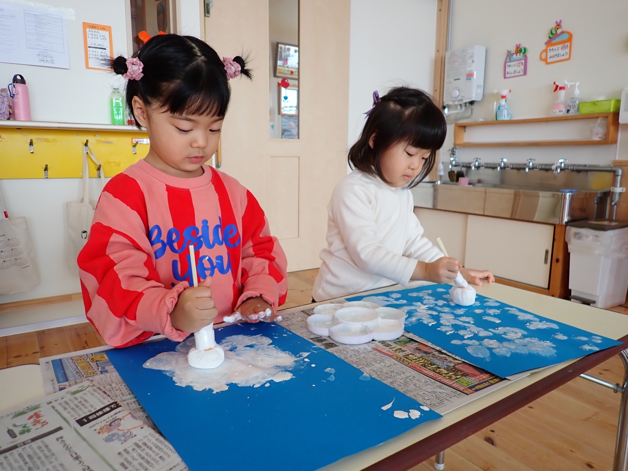 年長組のオニは、個性豊かです。顔の部分を自分なりに表現して、世界にひとつだけのオニです。髪の毛が素晴らしいオニは年中組。絵の具のスタンプでできています。今から楽しみですね。オニになりきって遊んでいたのは、年少組です。どこにいても「おには~そと~!!」と、かわいい声が聞こえてきました。豆を入れる、邪気を払う縁起物の枡も作りました。節分の準備は着々と進んできていますよ!