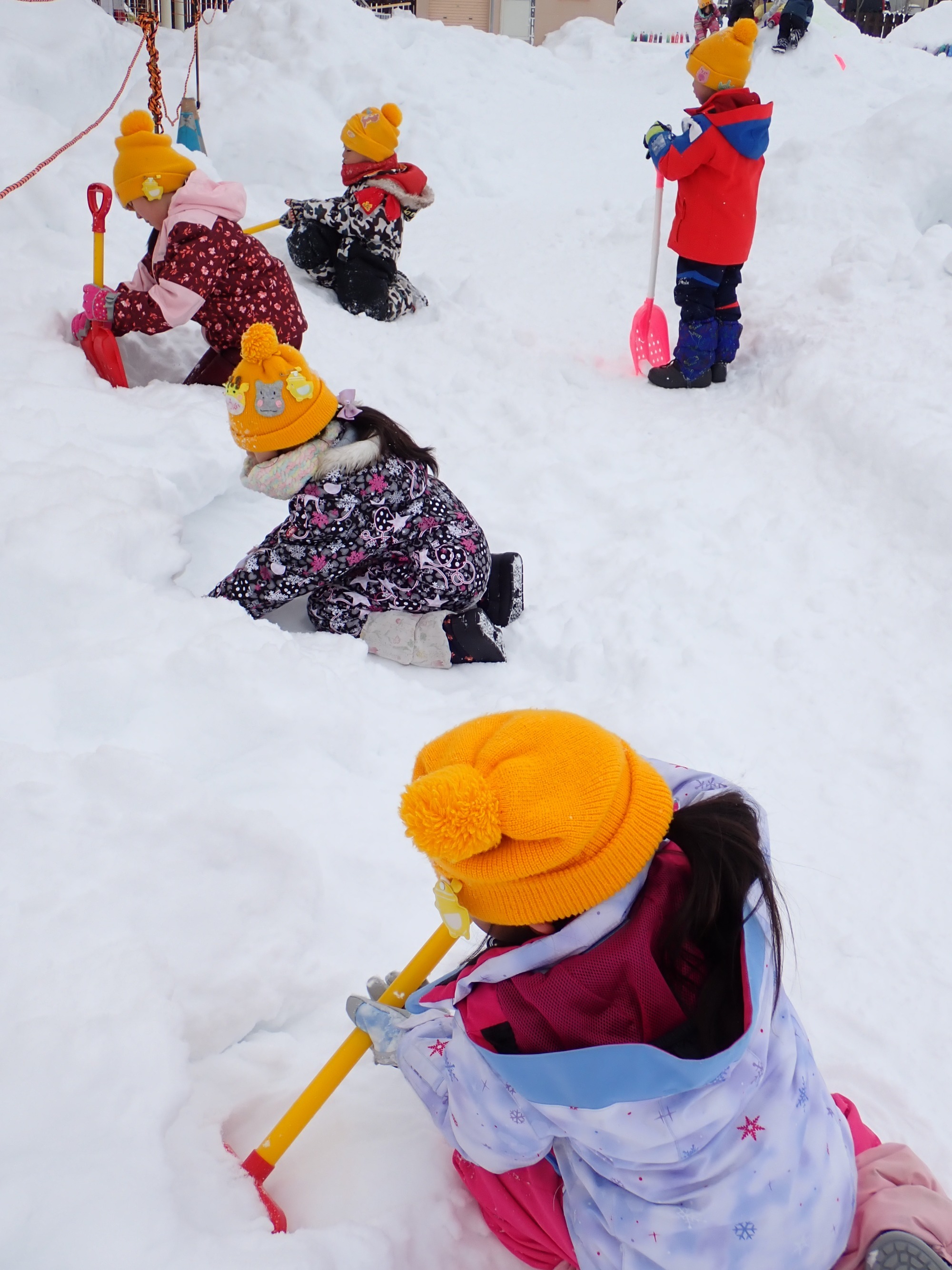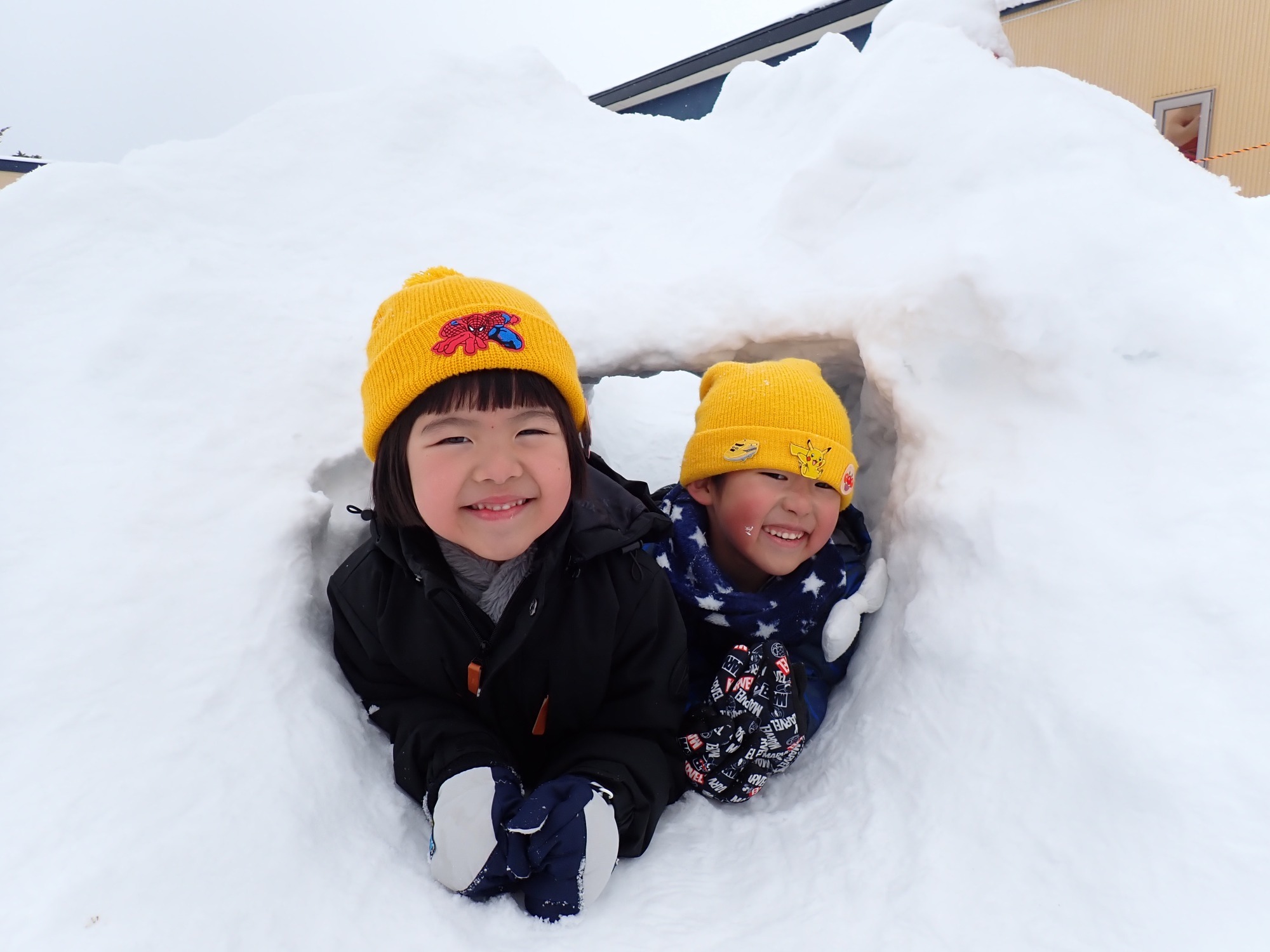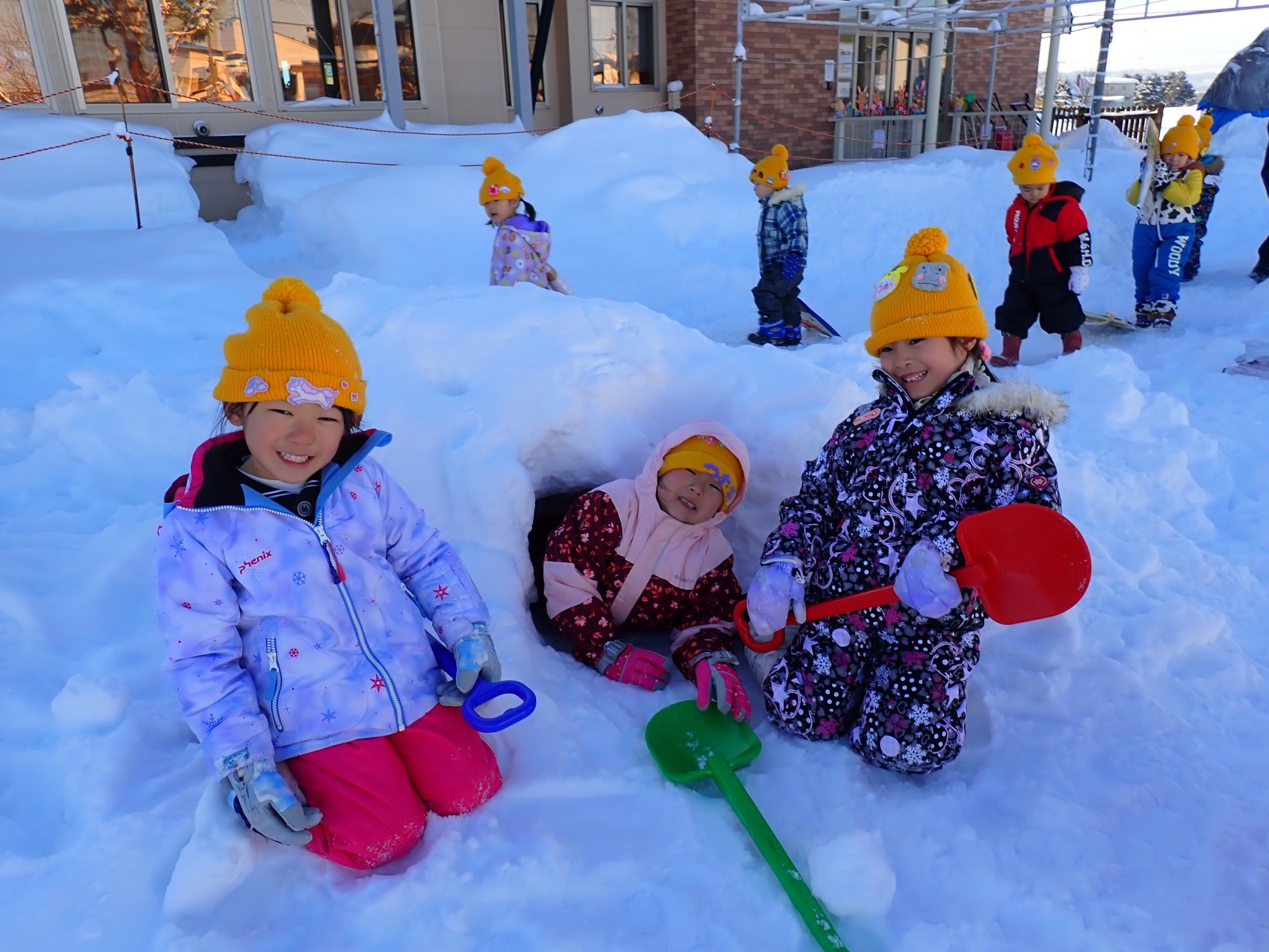 「かまど(竈?)だよ!」そんな難しいことも知っているようです。雪のトンネルも先週より精度があがりました。しっかりとできています。また、山の上から掘っている子もいて頼もしいですね。冬ならではのあそびが展開されています。