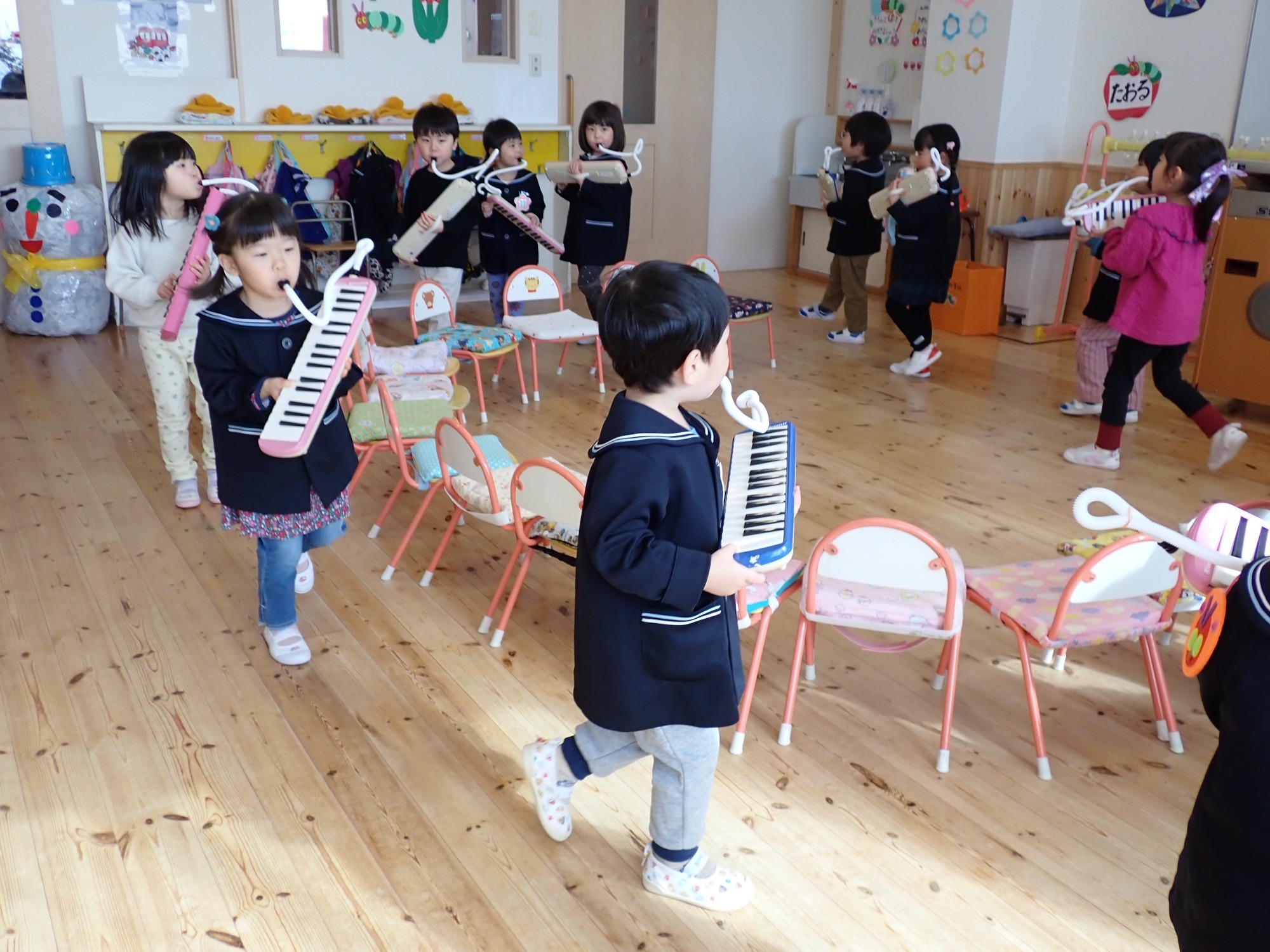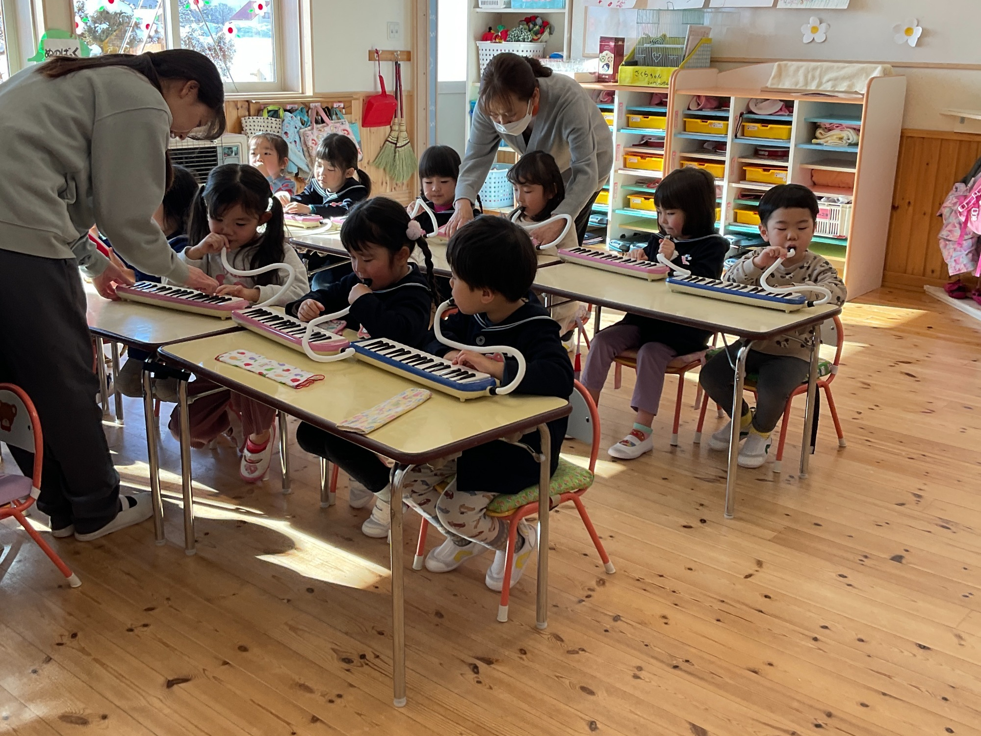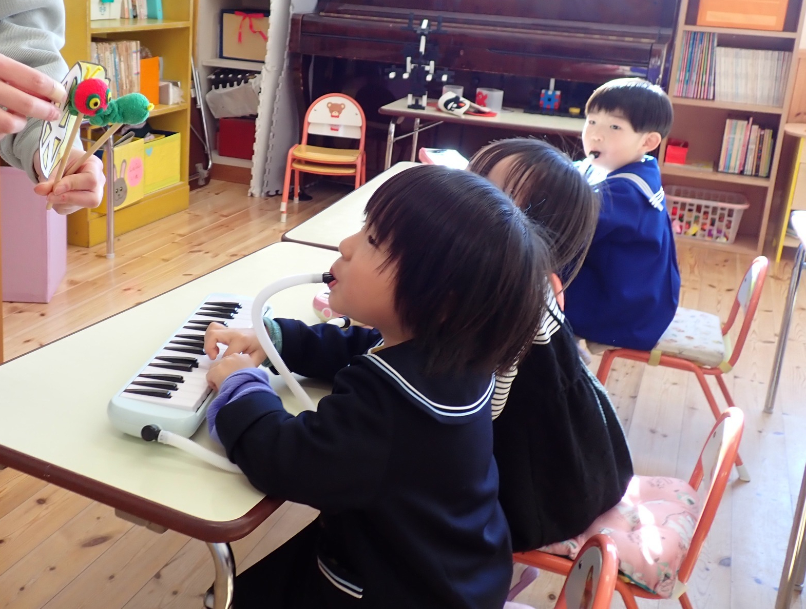 音楽が大好きな子どもたち。 リトミック太鼓でいろいろなリズムを打っていた年中組です。 初めに先生がお手本のリズムを打ちます。 それをしっかりと聞いて真似をしていました。 落ち着いて耳を傾けて、自分たちがリズムを打つときは楽しそう! 年長組は鍵盤ハーモニカ演奏です。 友だちとリズムを合わせて、できた時は達成感を味わっていました。 自分なりの表現を楽しむ子どもたちです。