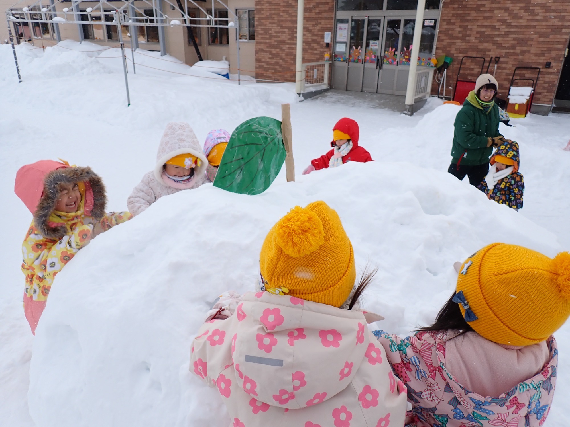 久しぶりの晴天でした。お散歩をしましたよ。雪の旭岳がくっきりときれいにみえました。「ヤッホー!!」と、自然と声があがりました。園庭を走る姿もあり、先生も子どもたちも元気いっぱいです。園庭の片隅にほんの少し残った雪。小さなかわいいゆきだるまができあがりました!