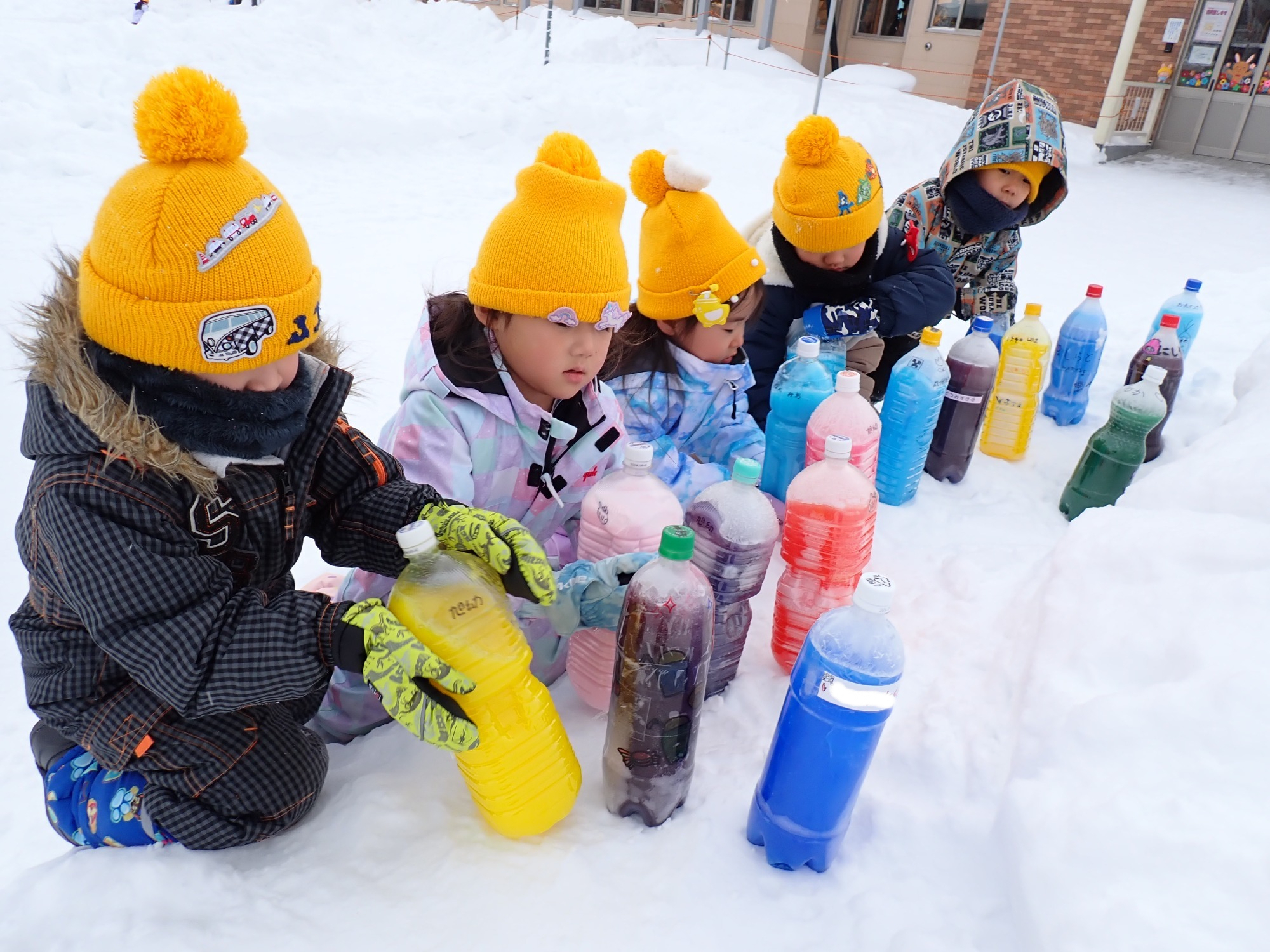 さて、子どもたちは、寒くても冬の造形あそびを楽しんでいます。ペットボトルに絵の具を入れて、力いっぱいシャカシャカとシェイク! 色が混ざり合って色水ができましたよ。次に、そのペットボトルを外に置きました。きれいな氷が見事にできることでしょう! こちらは、雪像づくりです。先生のお手伝いをしています。ヘタがついて、葉っぱが鮮やかで…何ができるかな?