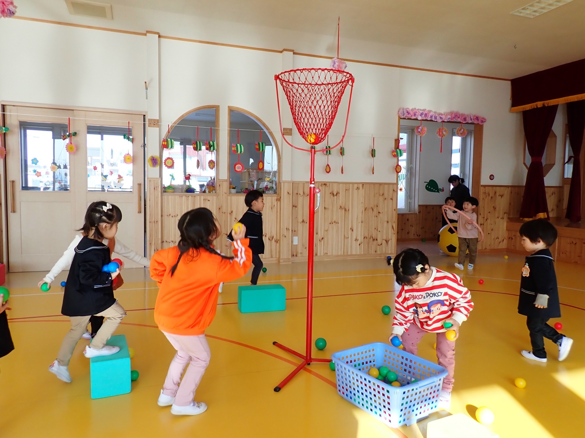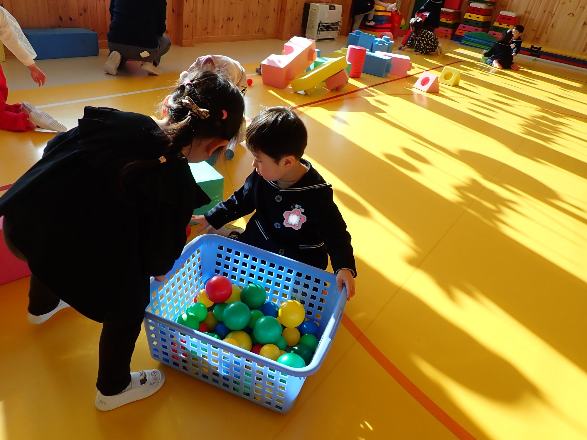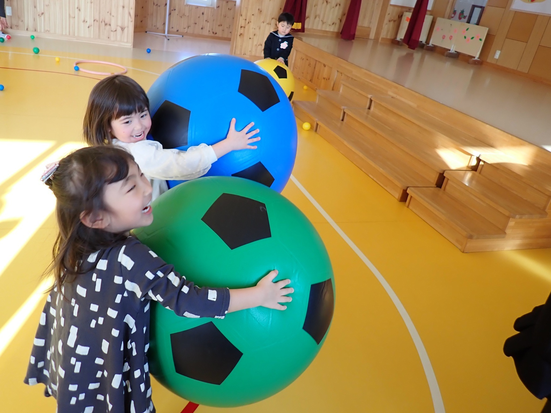 「玉入れ」には色鮮やかな小さいボールです。カゴを狙って「エイ!」上手に入ると嬉しそうでした。お片付けも、ほら、力を合わせてできました。そして、こんなに大きなボール! 大きいけれど軽いので、持ち上げることができました。笑顔で得意気ですね。大きいボールは、転がして遊ぶのも大好きな子どもたちです。
