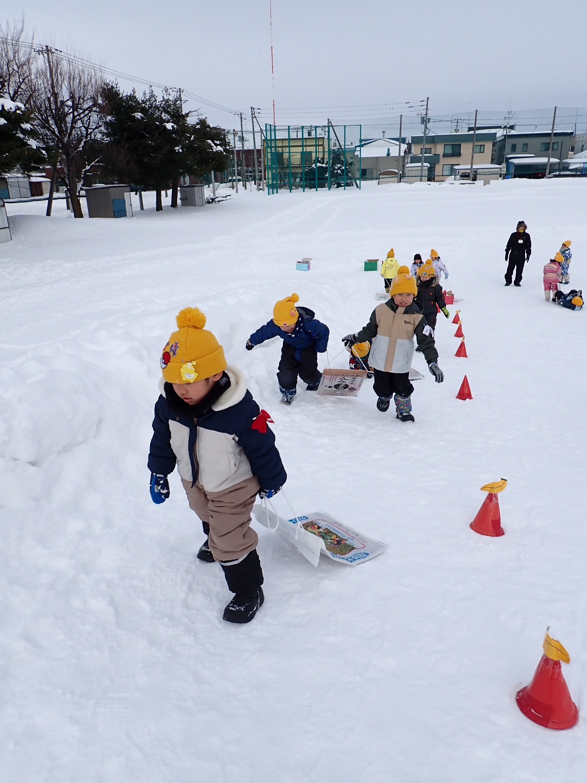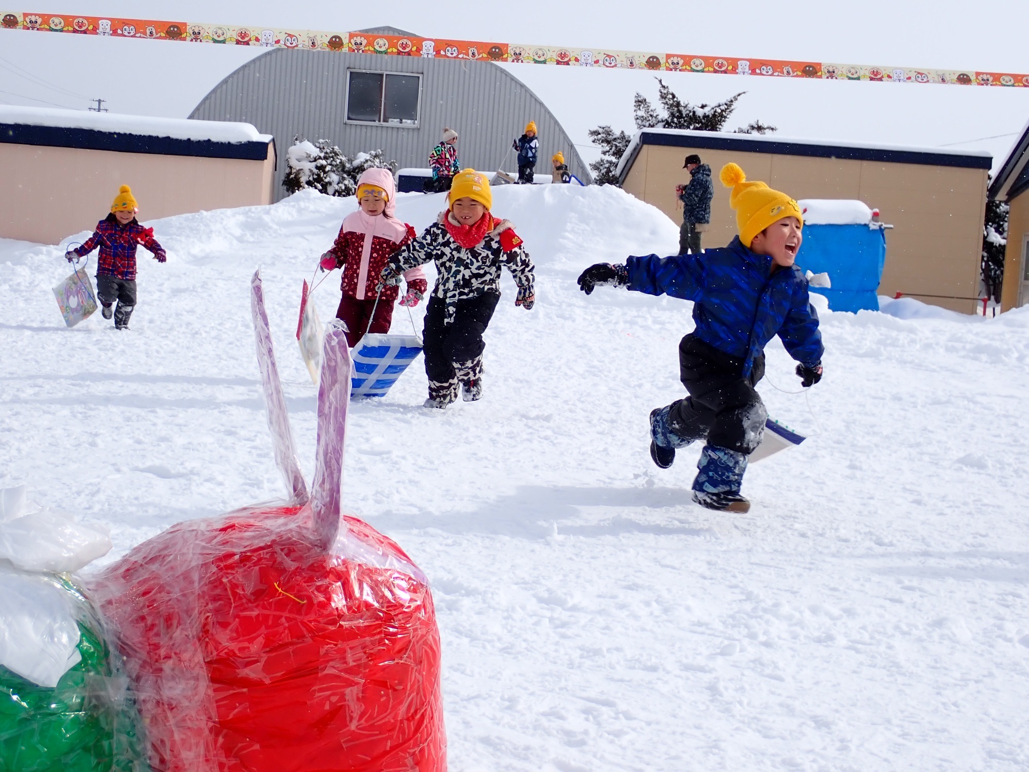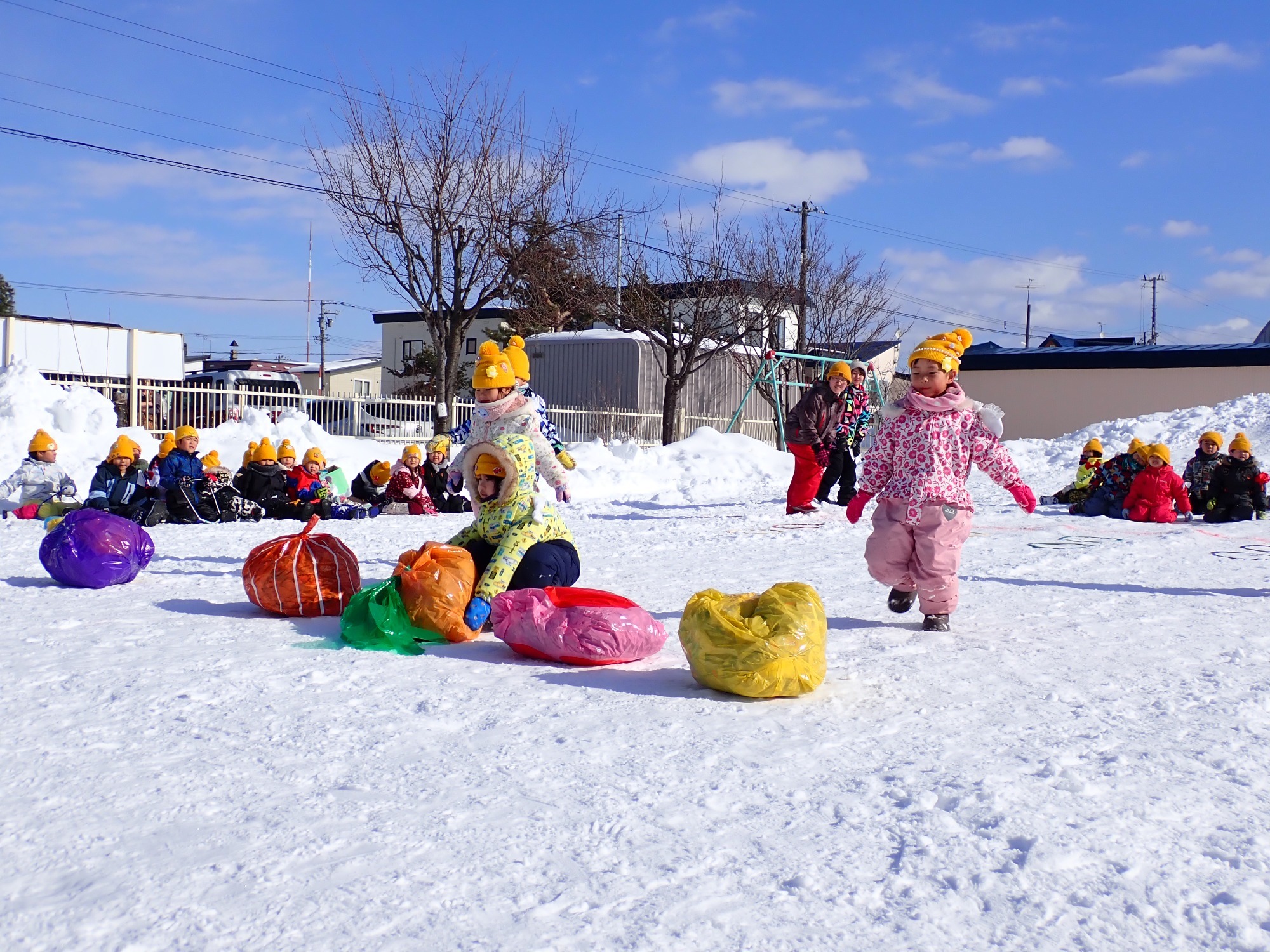 雪の園庭をスノーウエアを着て、走るのはちょっと大変ですが、みんな笑顔で走り切りました。転んでも平気! さすが北国の子どもたちです。当日は、保護者の方も、一緒に体操や親子競技で楽しみましょうね! 暖かくしていらしてください。