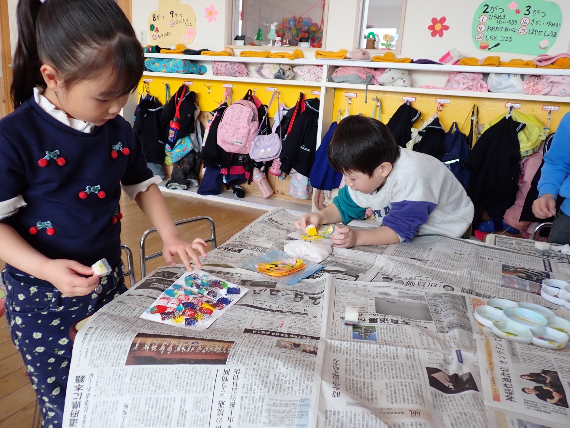 落ち着いた園生活を送る年長組。先生のお話に耳を傾ける姿も素晴らしいですね。また、旭川駅前イオンに掲示する「おかあさんのかお」も描いていました。(期間は後ほどお知らせします)色も力強く塗っていましたよ。自由あそびは、のびのび! お友だちと協力して紙コップでの造形を心から楽しんでいました。協力すること、折り合いをつけること、お互いを認めること…年長組ならではの遊びですね。