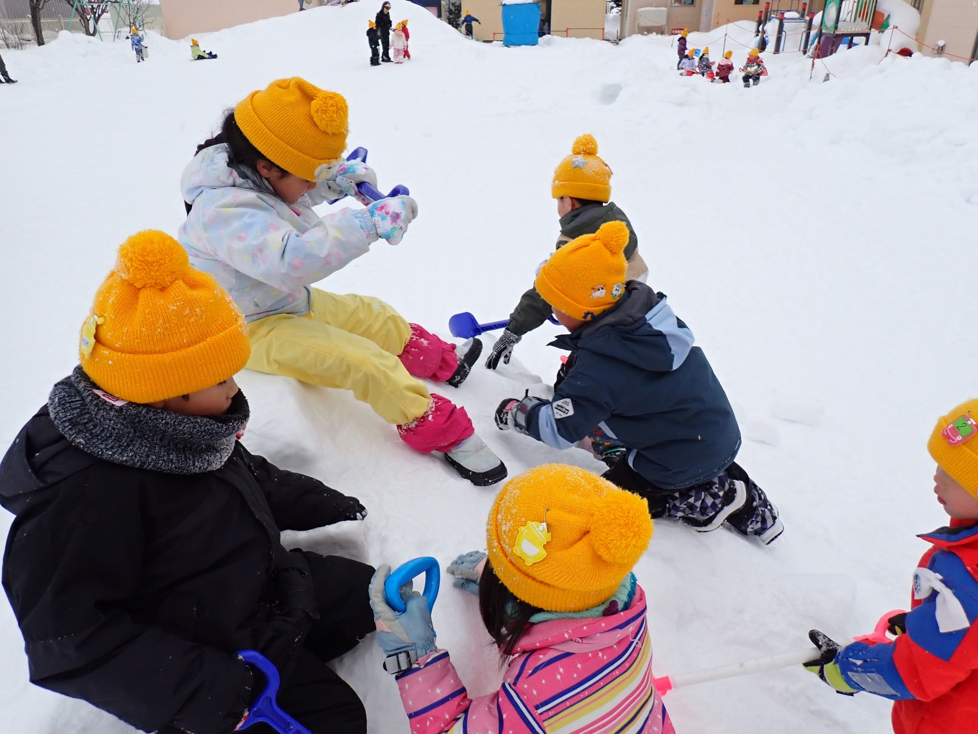 2学期よりも雪山が高くなり、そりのスピードもアップ! 何度も滑っていました。また、園庭のあちらこちらに小さな雪山ができています。トンネルを掘って貫通させたり、よじ登ったりしていました。もちろん、バナナボートも乗っていますよ。