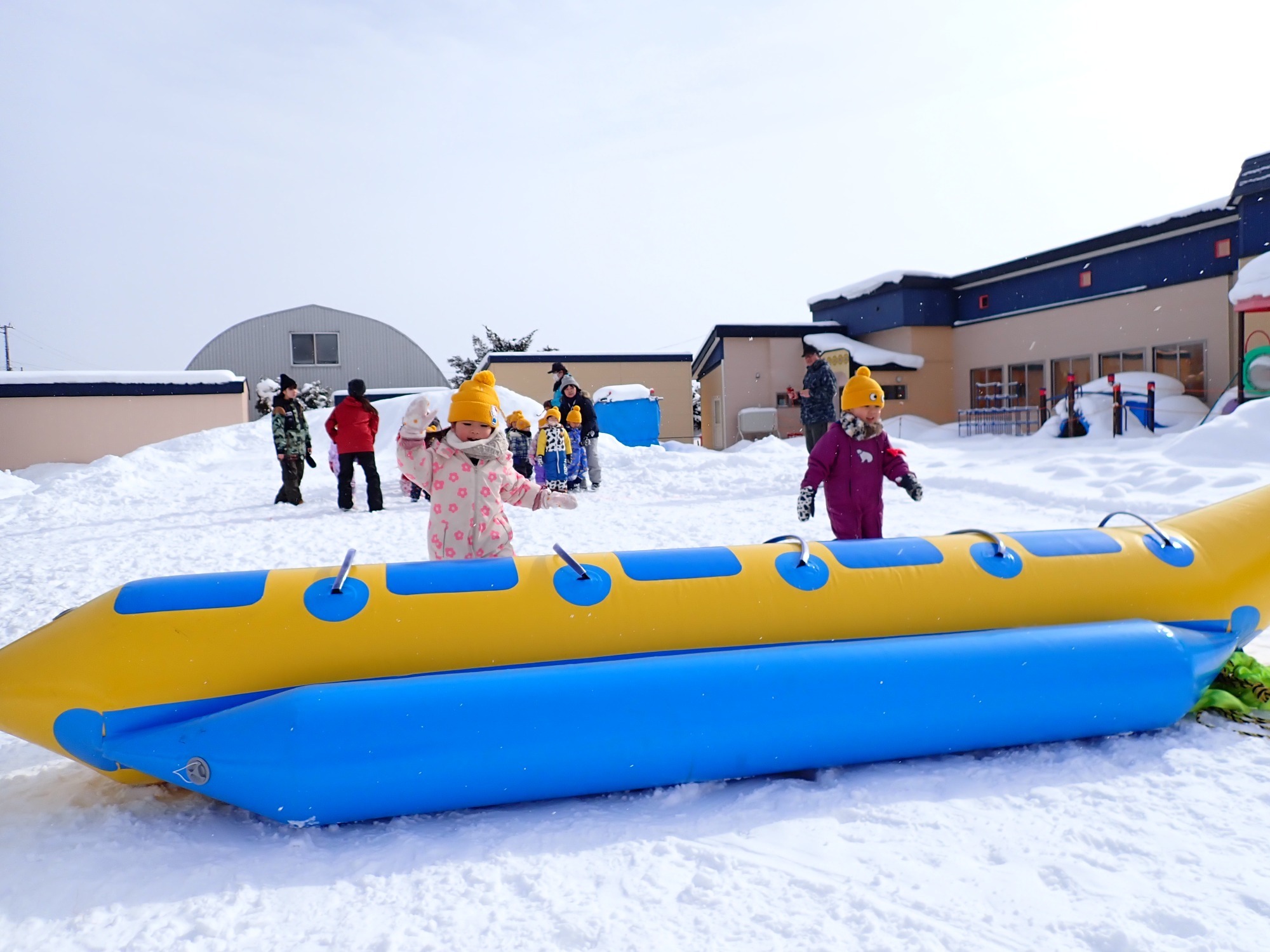 先週末の季節外れの雨で、園庭や駐車場の雪がとけてしましました。コンディションが悪く、バナナボートは残念ながら車庫でお休みです。