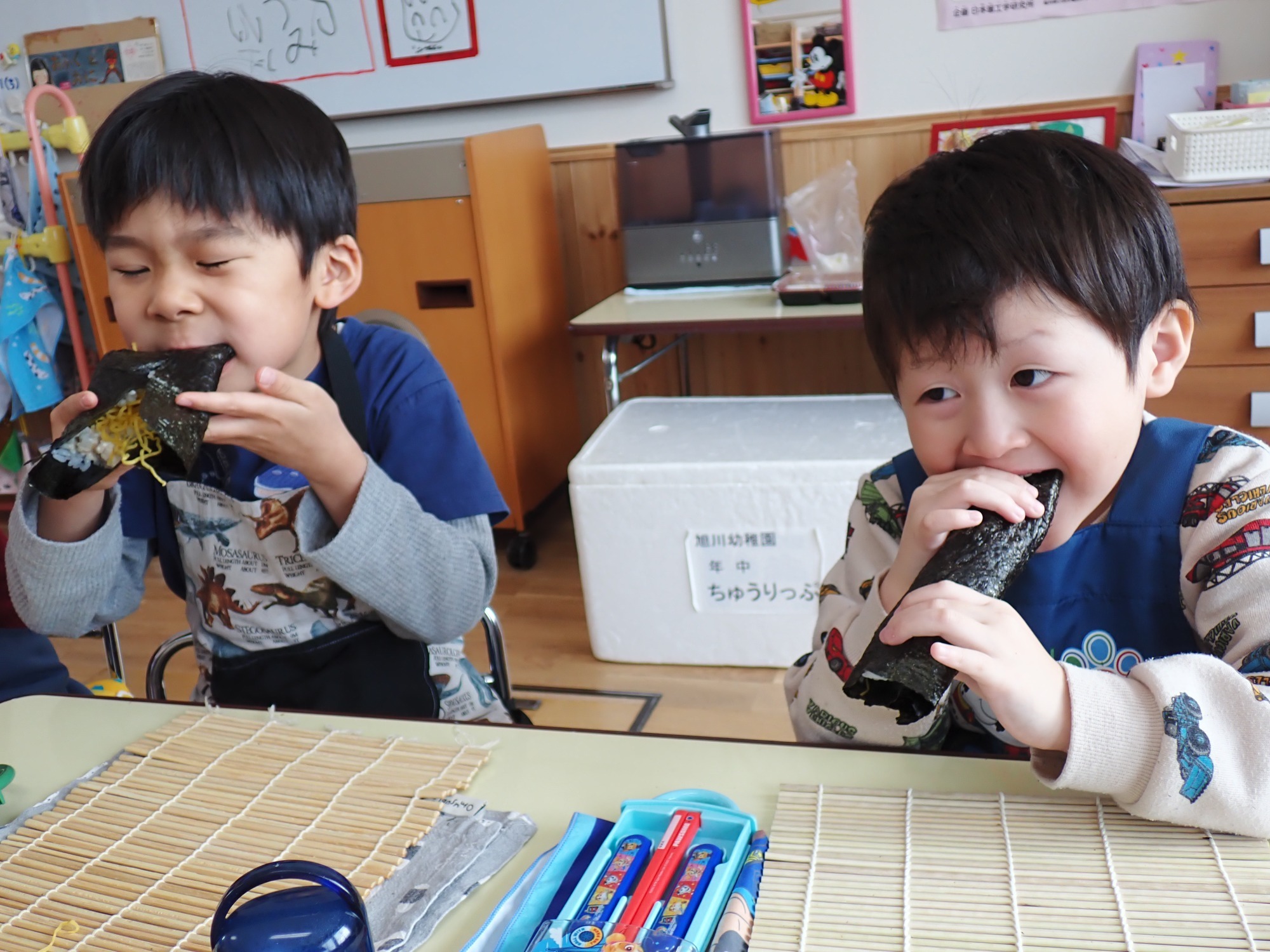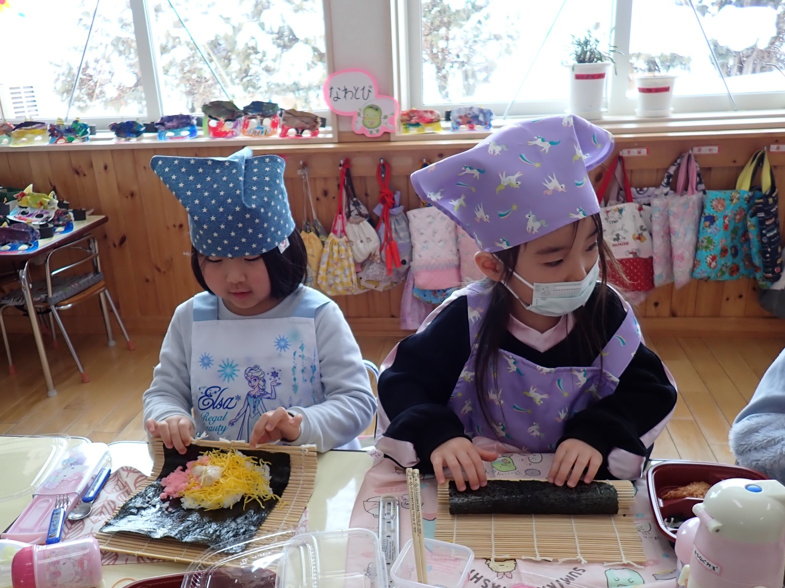 豆まきの後は、自分の恵方巻を作りました。恵方は、南南東。静かに、かぶりついていました。福の神様に見守られて、みんなのところには幸せが訪れることでしょう…