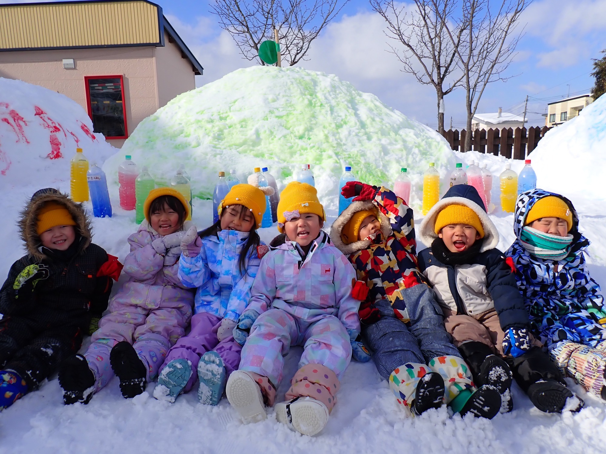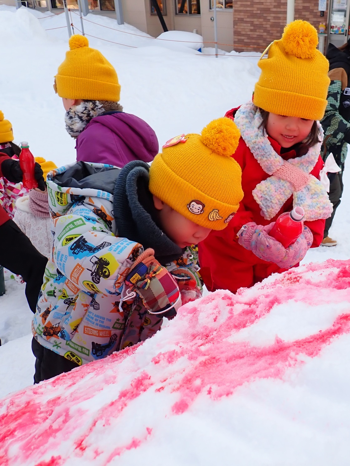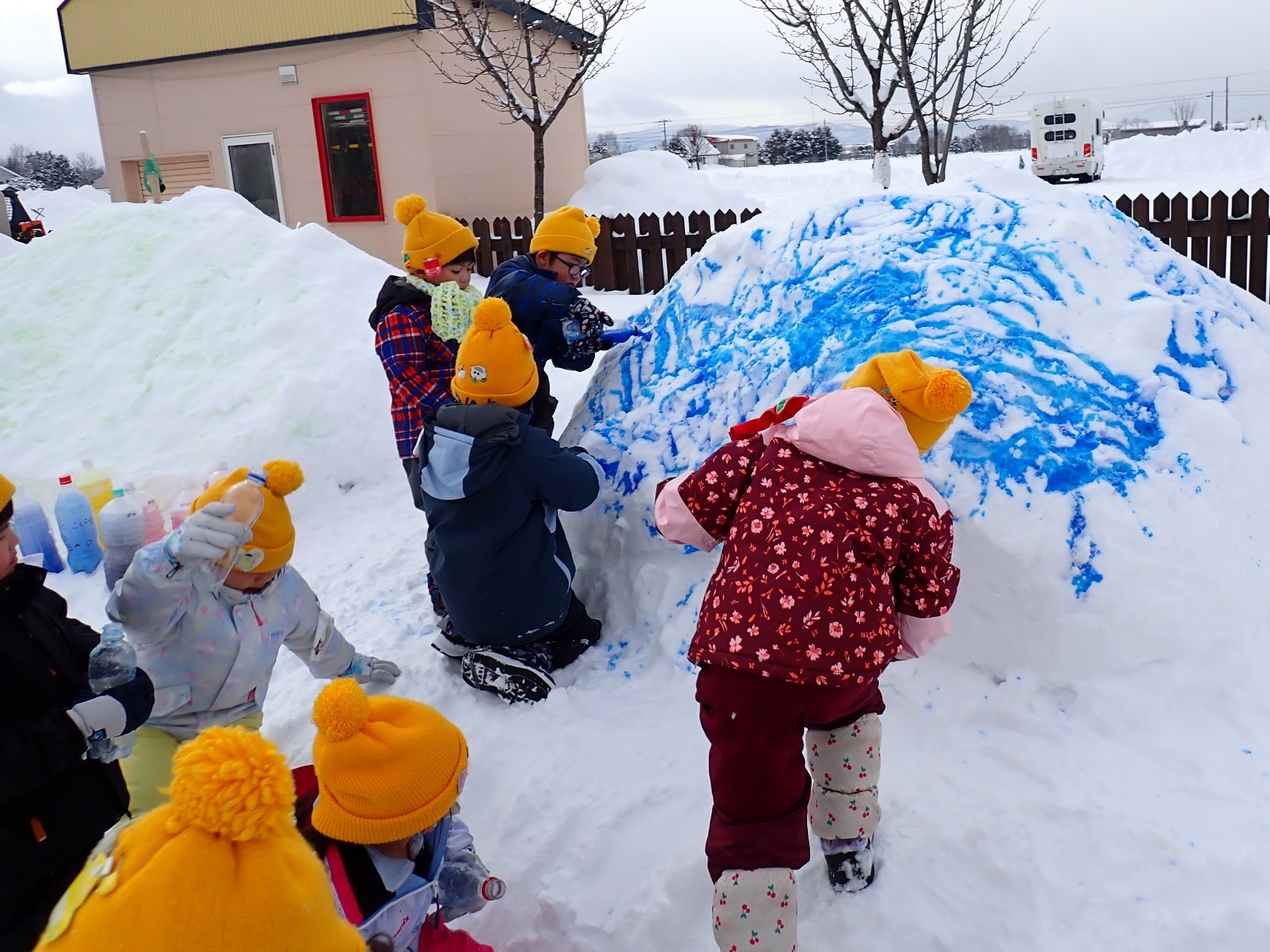 今年の保育のテーマの「はらぺこあおむし」にちなんで、あおむしくんの食べ物の雪像です。赤いりんごは年少組。黄緑色のなしは年中組。年長組は青いすももです。どの学年も、担任の先生と力を合わせて、完成しました。特に色水を使っての色付けはどの子も真剣。すてきにできましたね。あおむしくんも喜んで食べて、おなかがいっぱいになるのでは⁉