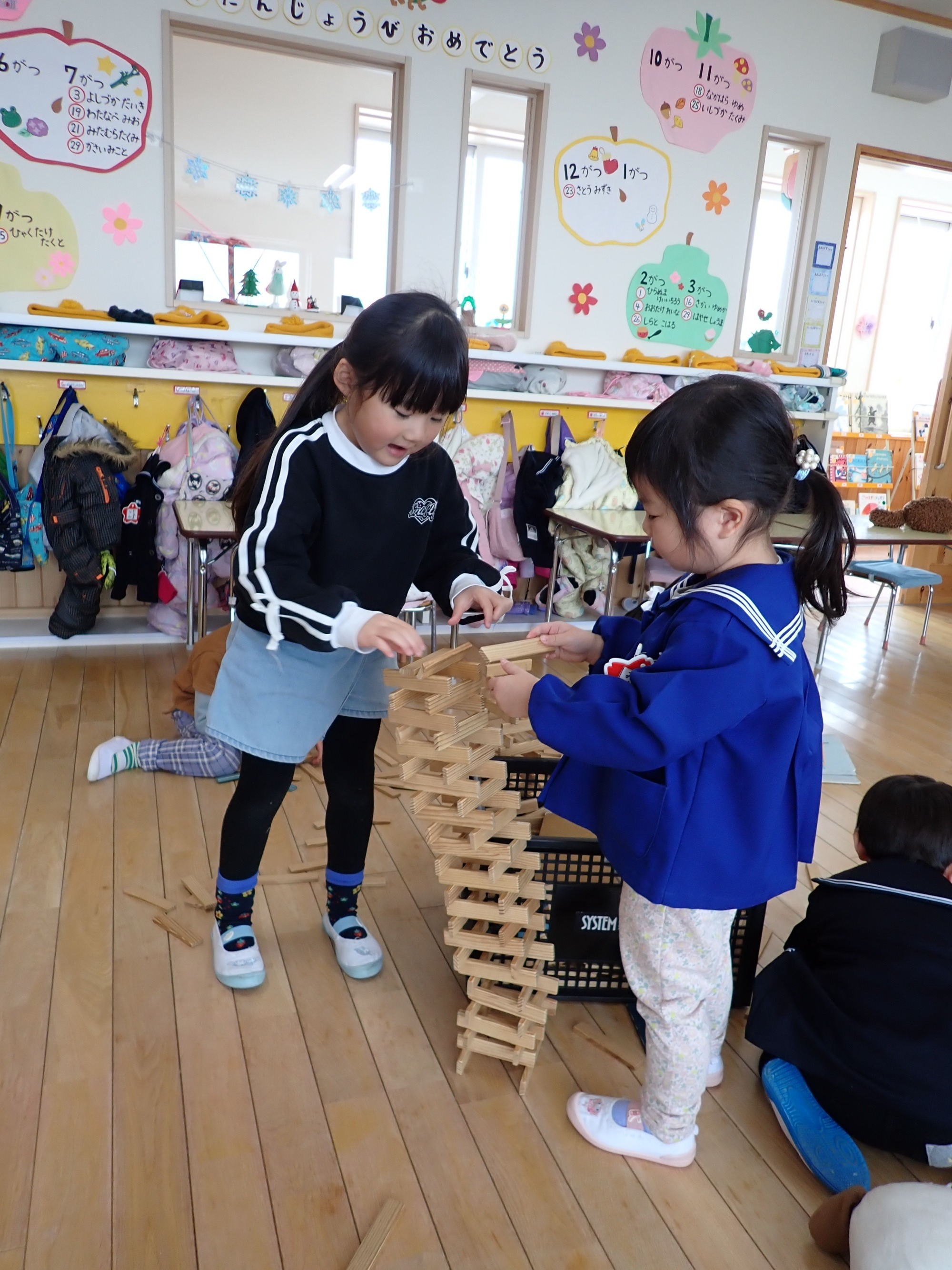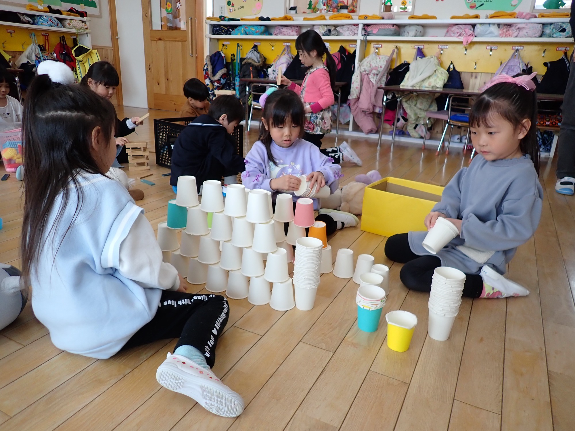 今日は、室内で遊びました。積み木のカプラでお友だちと協力して積んだり、紙コップでの造形あそびも、根気強く続けていました。どちらも壊れても壊れても、再チャレンジ!です。