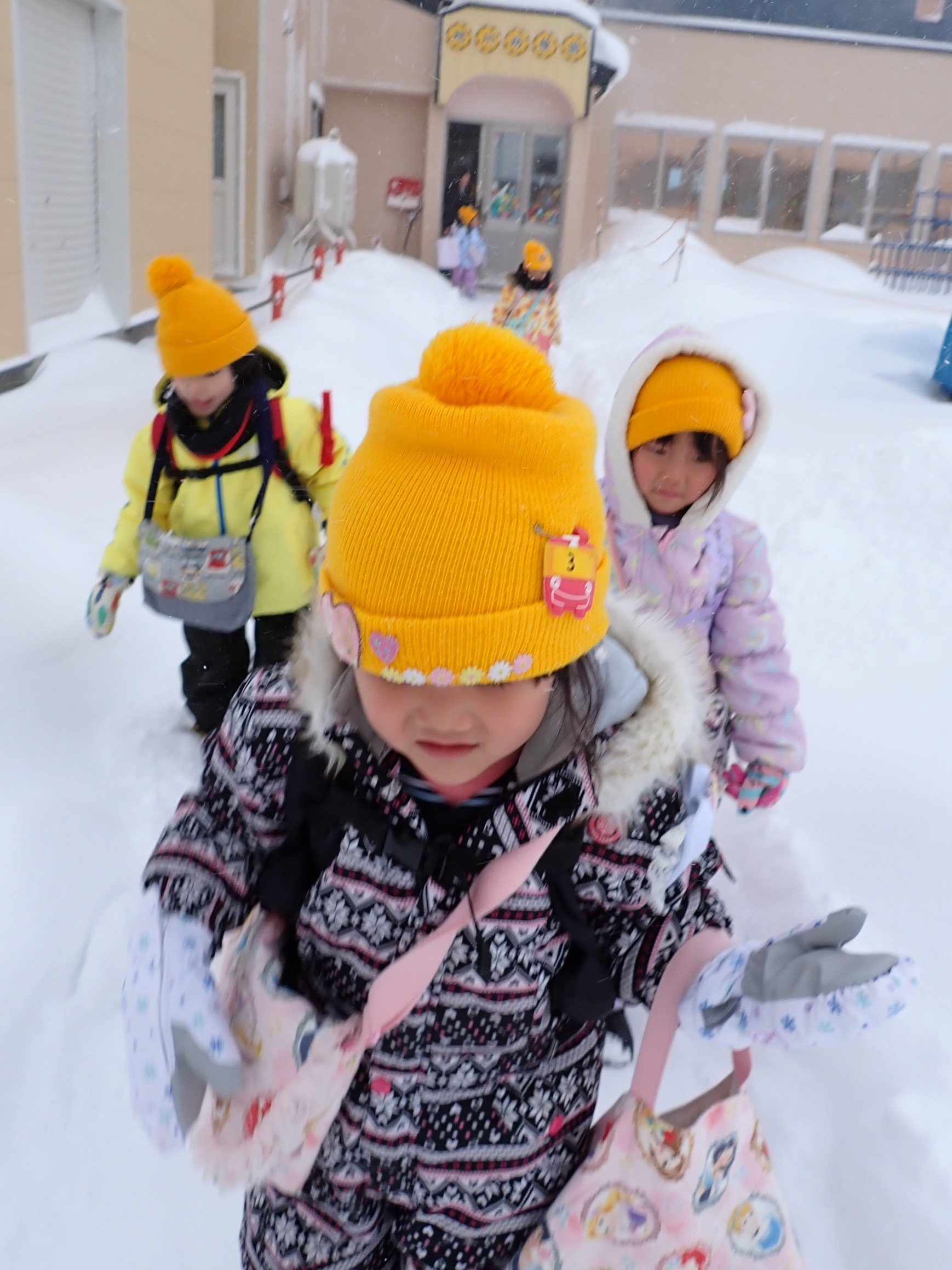 園児が降園する時も、雪が降り風も強く、除雪をしてもあっという間に雪が積もっていました。お帰りの園バスも無事、保護者の皆様のもとに大切なお子さんを送り届けることができて何よりでした。