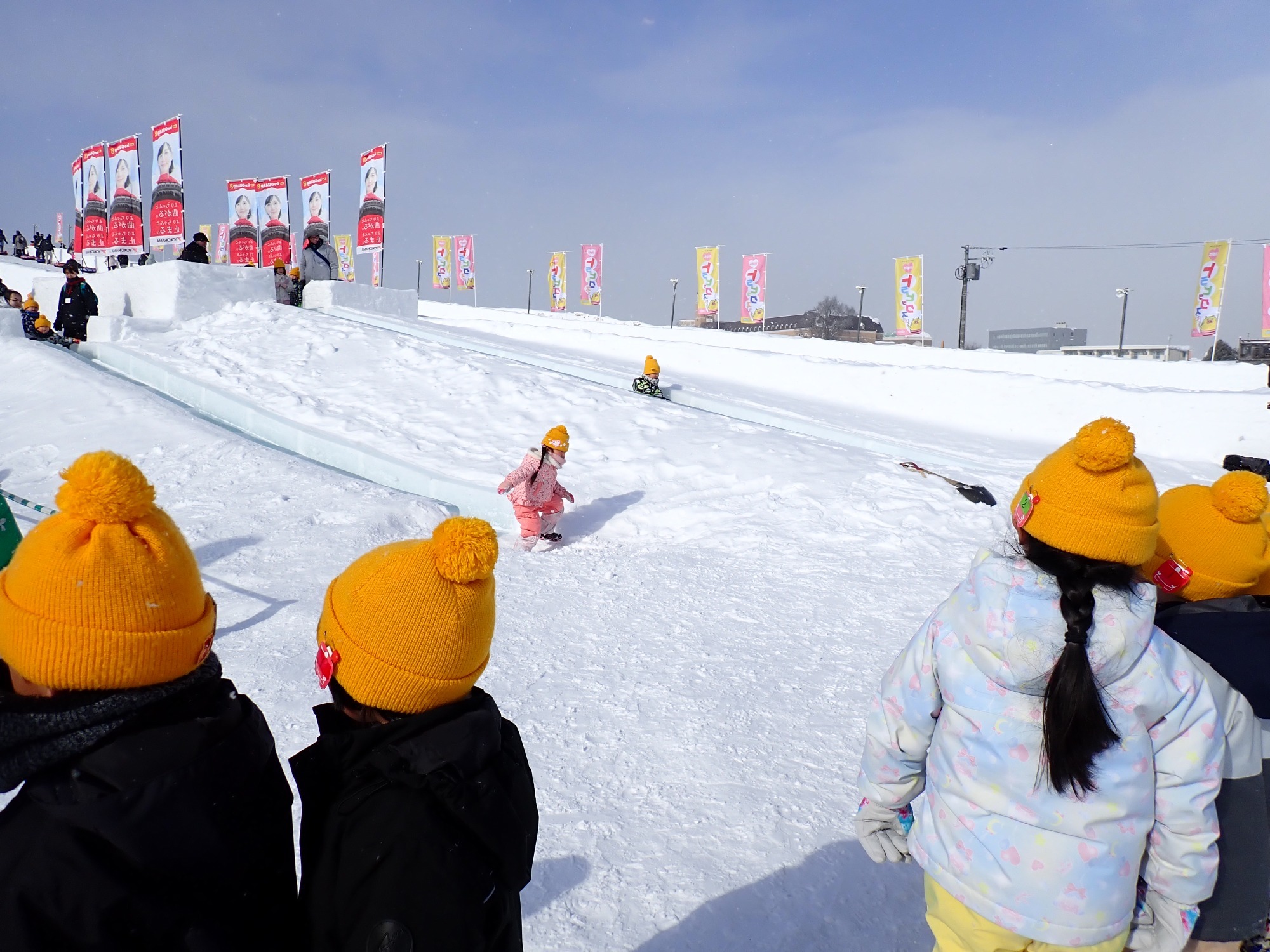 旭橋河川敷には、たくさんの雪像や氷の滑り台があり、ワクワクします。早速、一人ずつ、氷の滑り台を楽しそうに滑り降りてきました。氷がキラキラと光っていて、きれいでしたよ。雪像もみんなで見ました。「アンパンマン、大好き!」、「ポケモン、あるよ」、「おべんとうバスだ」と、笑顔です。お友だちと一緒ですから、楽しさも増しているようですね。ステージでは、「耐寒ラジオ体操・みんなの体操会」をしていました。「体操、したい!!」と、元気な子ども達。市民の方々と一緒に参加しました。風が少し冷たく感じましたが、今日も北国の冬を満喫した子ども達です。
