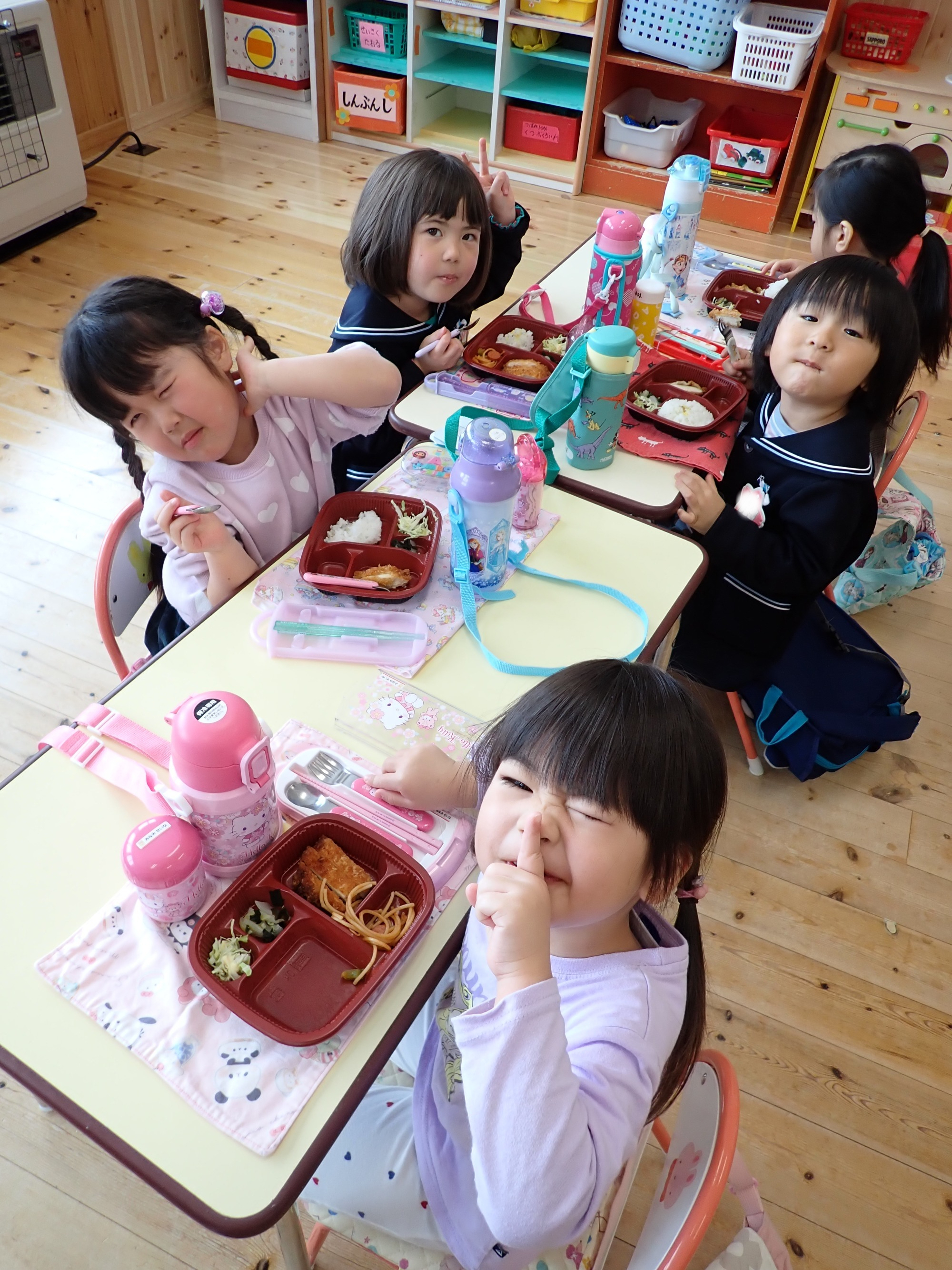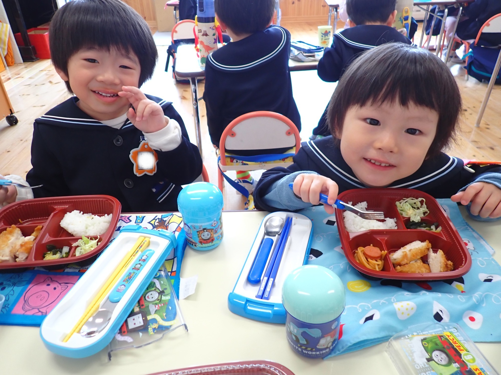 みんなで同じお昼ご飯、今日は給食日です。メニューは、“チキンカツ・サラダ・スパゲティ・すのもの・ごはん”でした。おいしくいただきましたよ。1学期の頃より、食べられる食べ物や量が増えてきた年少組です。年中・年長組は、大好きなお肉料理に大喜びでした。ほら、もうからっぽ! みんな、何でも食べて、大きくなろうね!