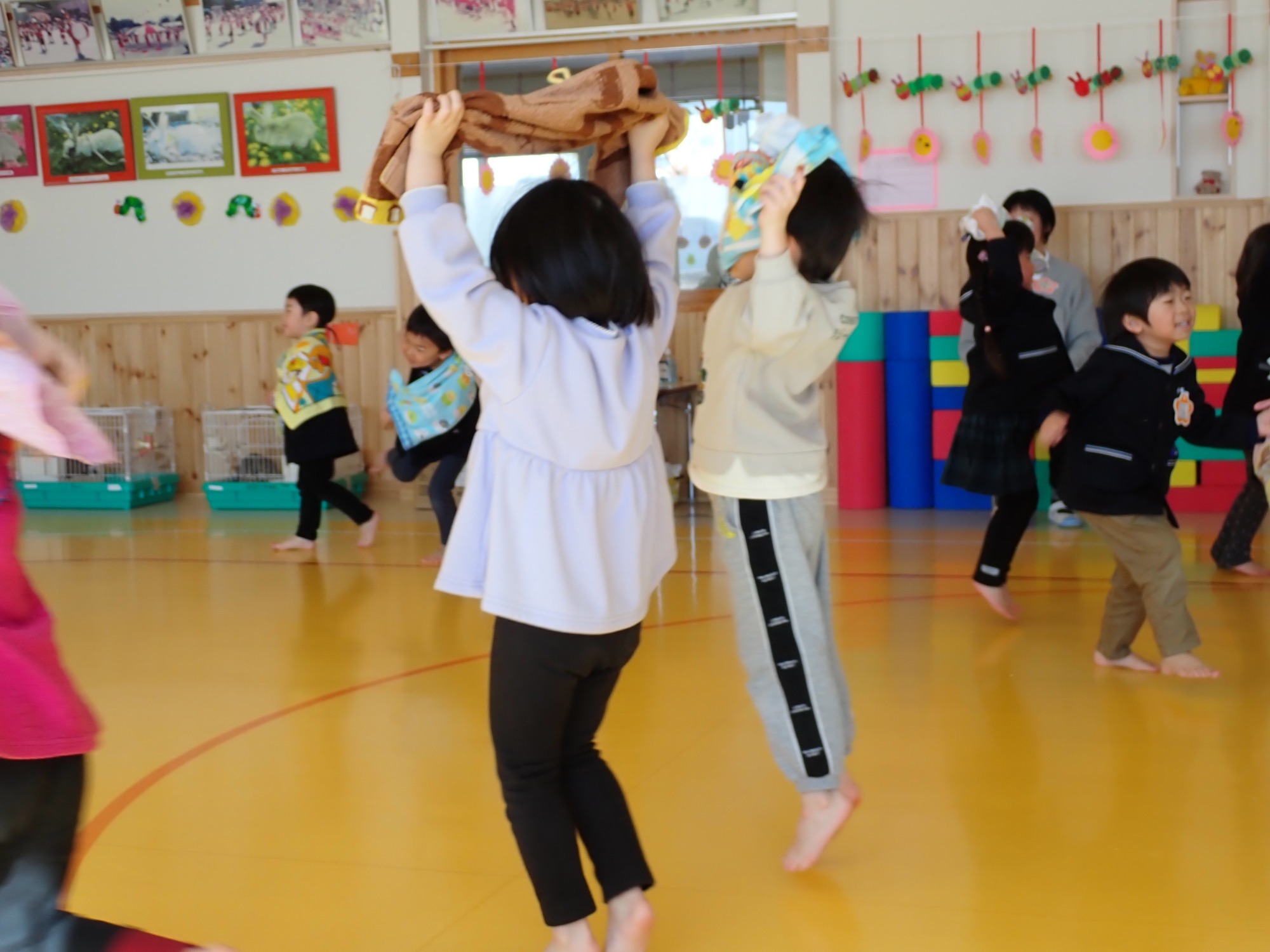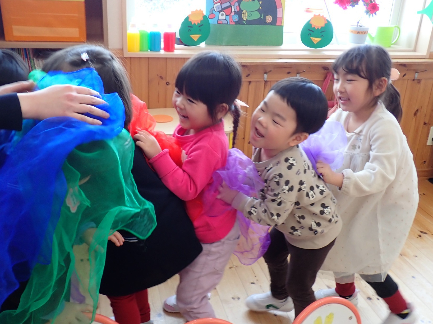 はらぺこあおむしがちょうちょうになった羽のリトミックをした年中組です。羽は運動会の競技に使いました。ピアノに合わせて舞う姿がきれいでした。途中、休憩タイム! 食べ物を食べて(食べ物カードを見つけます)、また飛んでいきました。さあ、次はどこへ飛んでいこうかな…