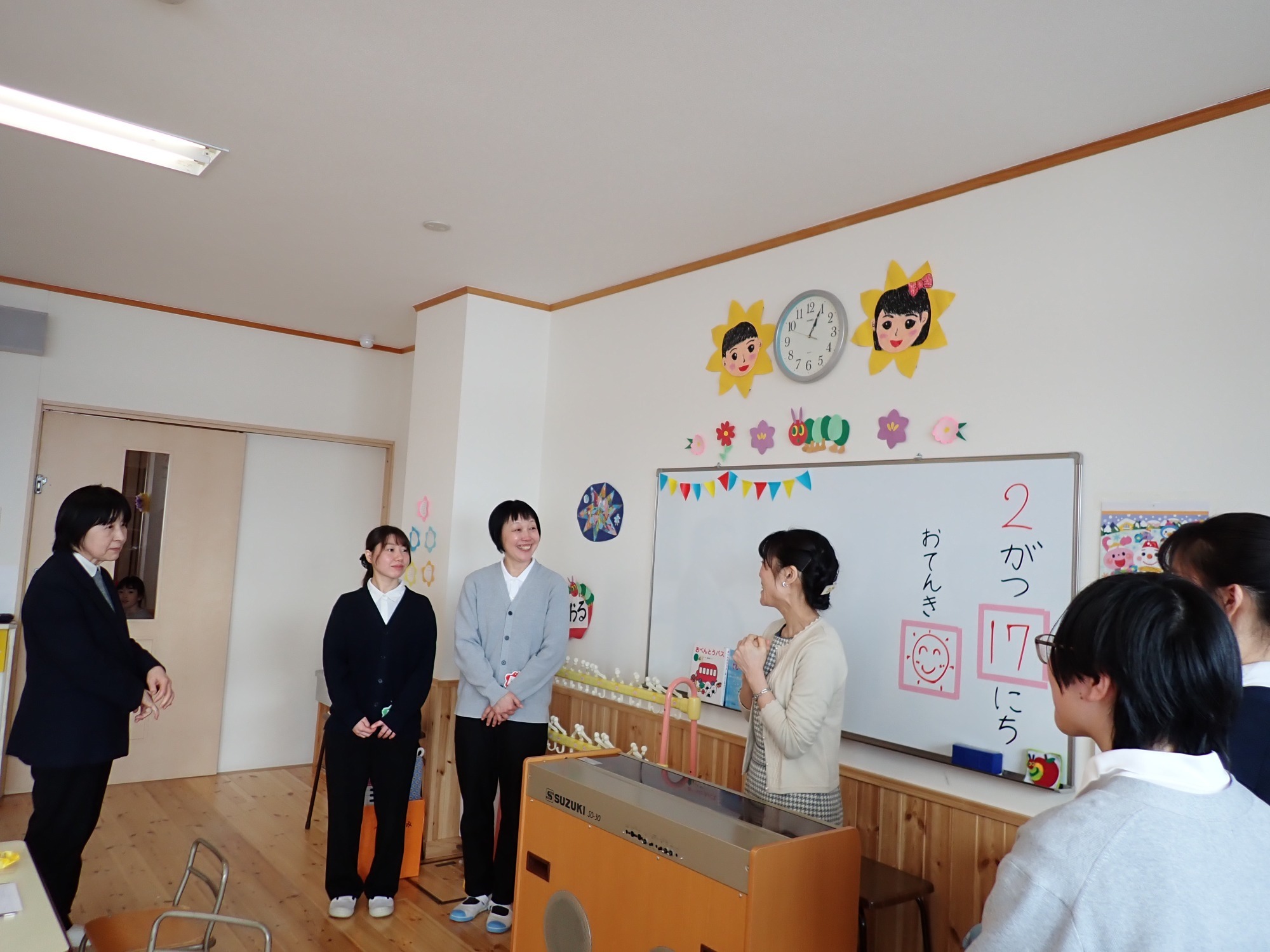 今年度の園内研究保育の締めくくりは年少組です。純粋なつぶやき、動く姿、つぶらな眼差しなど年少組ならではのかわいさがいっぱいでした。そんなかわいい年少組ですが、鍵盤ハーモニカを持って、演奏しながら歩くこともできました。また、型にはまることなく、自分で動いて楽しむリトミックにも笑顔が見られました。保育の後は、研究討議です。今日はピアニストで音楽講師の中村幸先生にも、保育を見ていただきました。専門的なことを質問したり、助言をいただき、自分たちだけの討議以上に実のある研修となりました。明日からの保育活動に役立てていこうと思います。保護者の皆様、ご協力いただき、ありがとうございました。