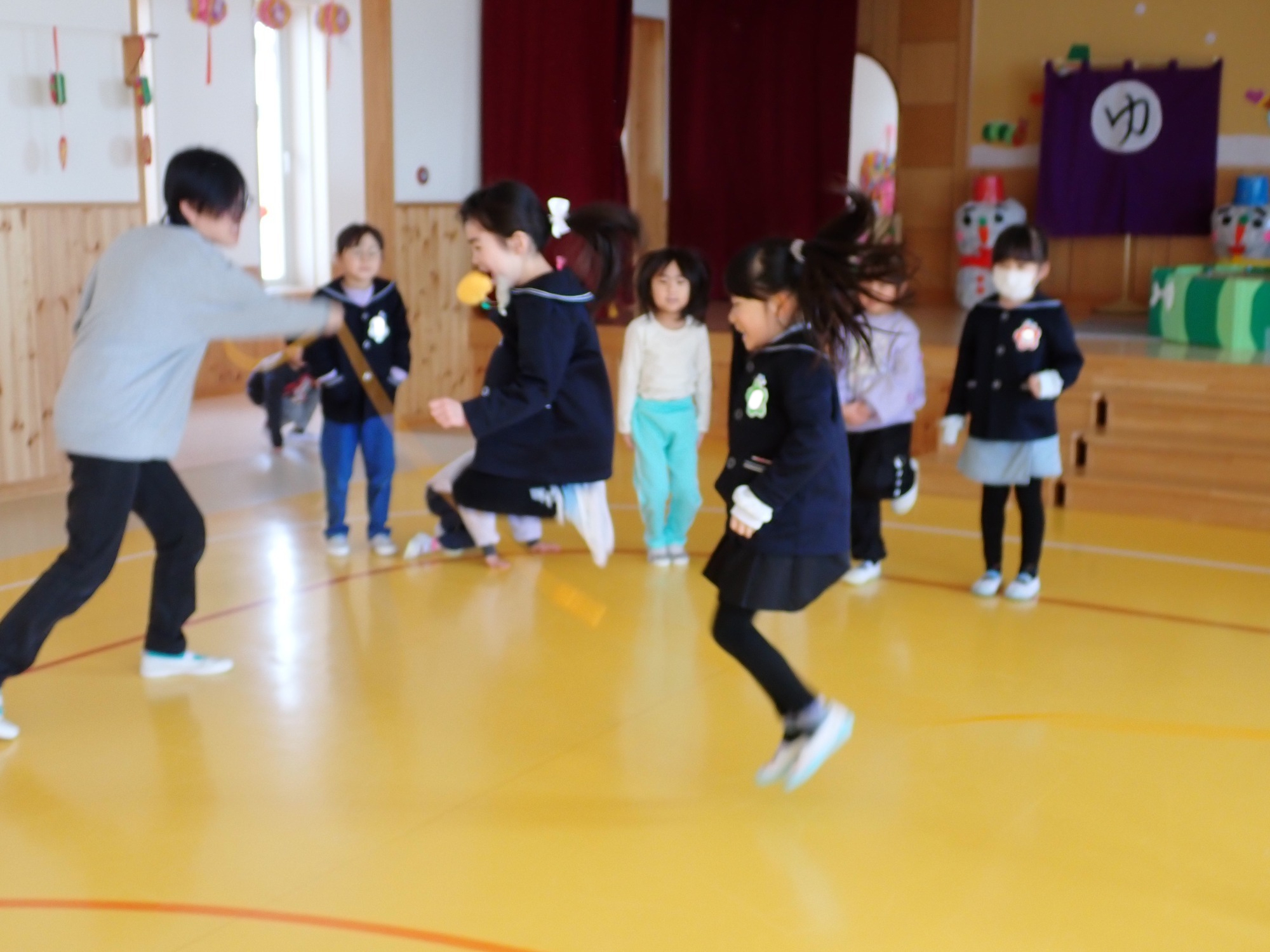 みんなでオニのお面をかぶって集まりました。園長先生のお話を聞いて、歌をうたって、豆まきの始まりです。「おには~そと~!!」と、張り子のオニに手作りの新聞紙の豆をまきました。すると!「ウワー!!」と、青鬼の登場です! びっくりした子どもたち。オニは、みんなに囲まれて、「まいった まいった~」と、退散して行きました。