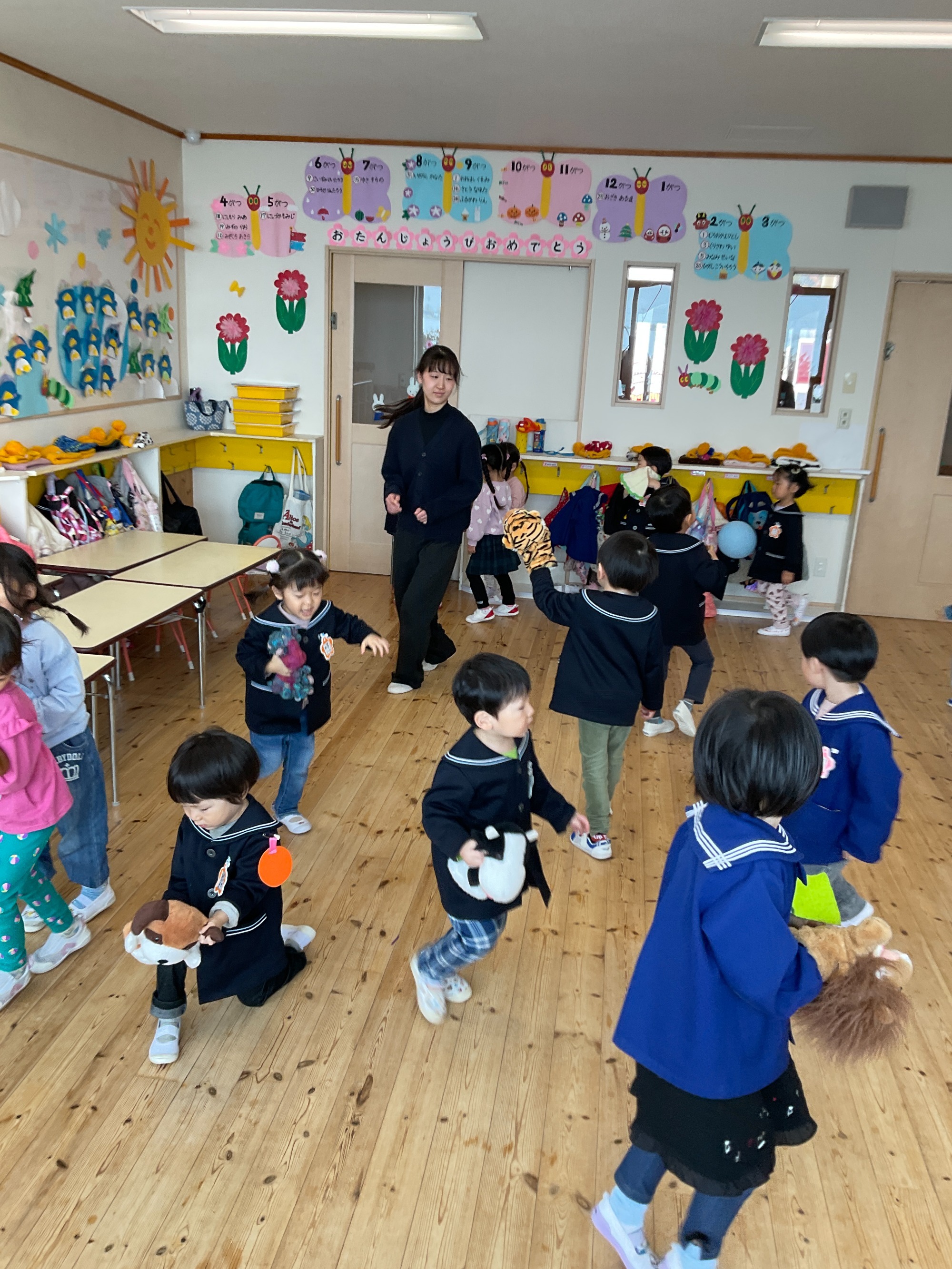 年長組は、音楽に合わせて太鼓演奏をしたり担任の先生のペープサートに大喜びでした。幼稚園のリーダーとしての自覚が少しずつ芽生えてきているようです。