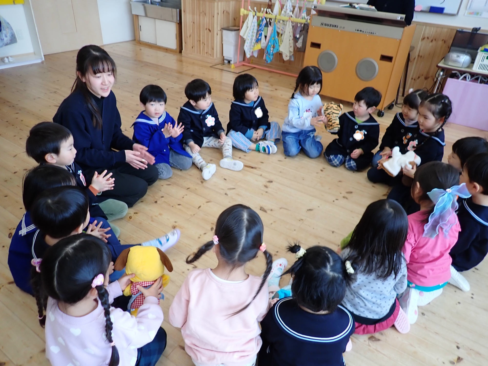 今年度最初の「英語であそぼうの日」でした。年少組は、ほとんどの子が英語の先生と初対面です。先生が「Nice to meet you」と、一人ひとりに挨拶してくれました。子どもたちは自分の名前を言うことができていました。“よろしくお願いします”の気持ちを込めて… 入園・進級間もない子どもたちですが素晴らしかったです。そしてお別れのあいさつ「See you!」と、手を振りました。