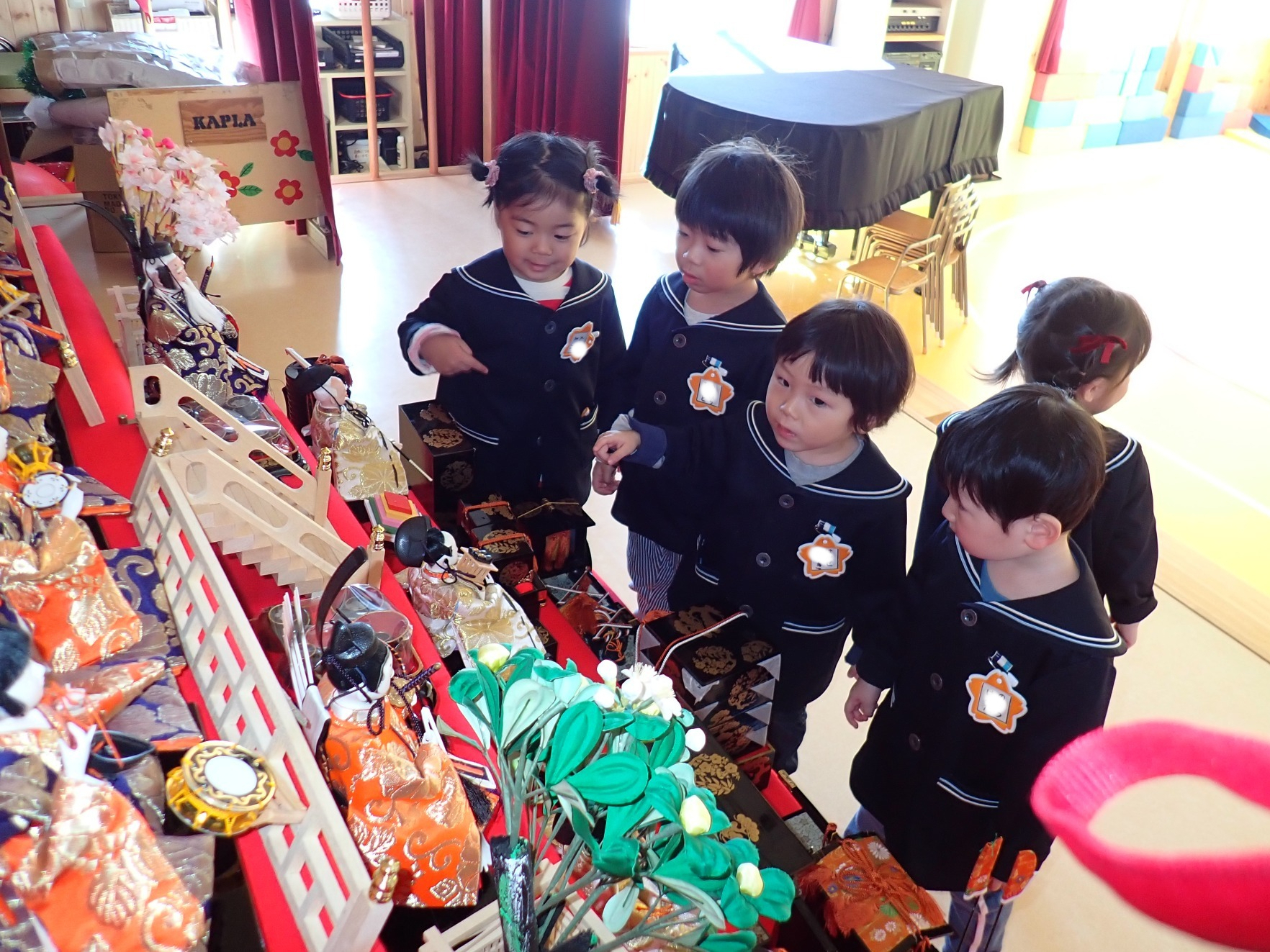 お人形やお道具を大事に抱えて、段飾りに飾ります。「このお人形は、どこかな?」、「このお道具はどこ?」と、一生懸命にそして丁寧に飾りましたよ。できあがりを見に来た、年少組。きれいな着物や美しい顔にうっとりです。